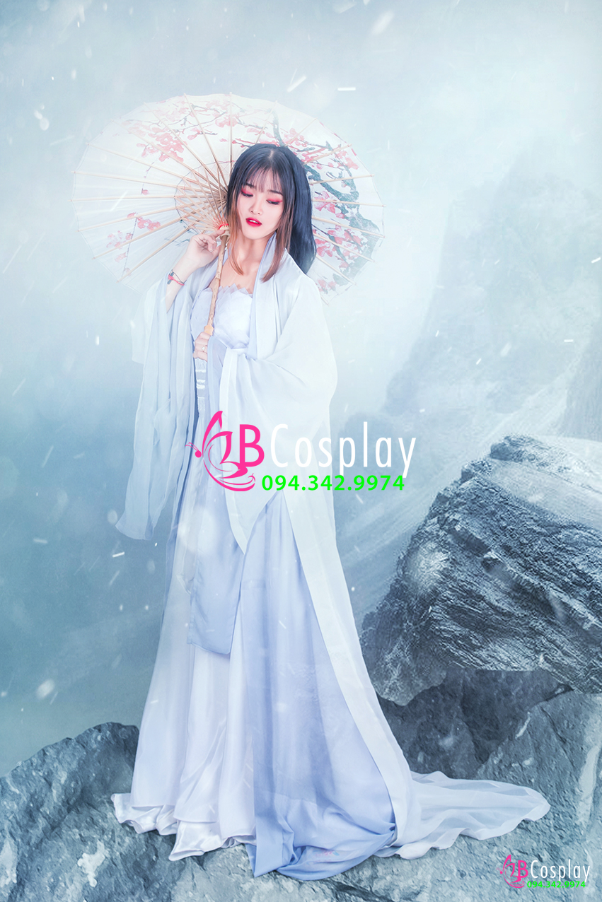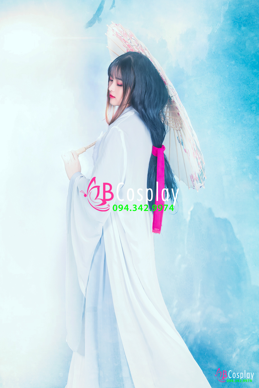 yếm ren liền váy voan dài + áo voan nhung xám + áo voan nhung trắng + đai gấm trắng