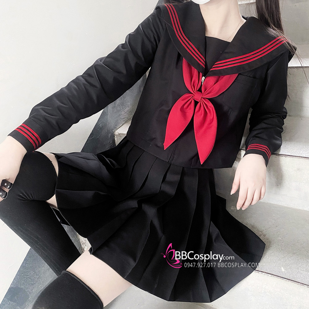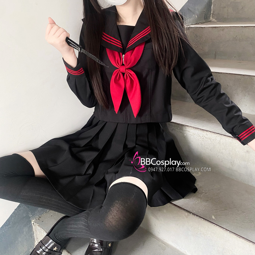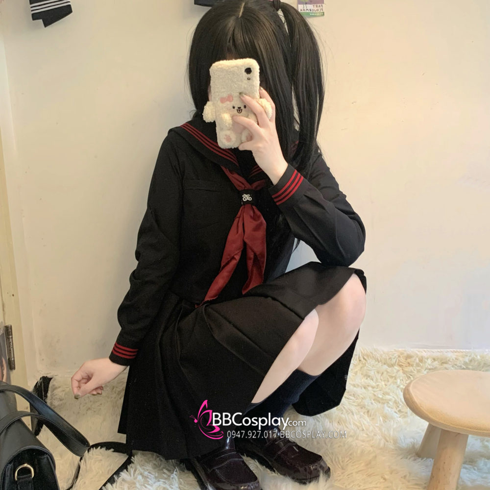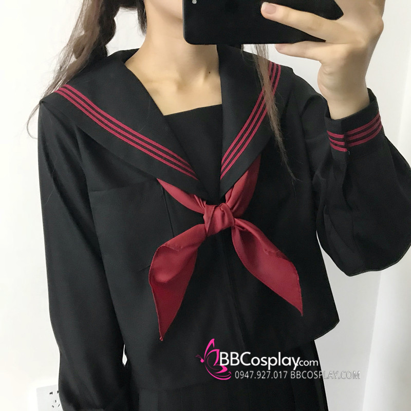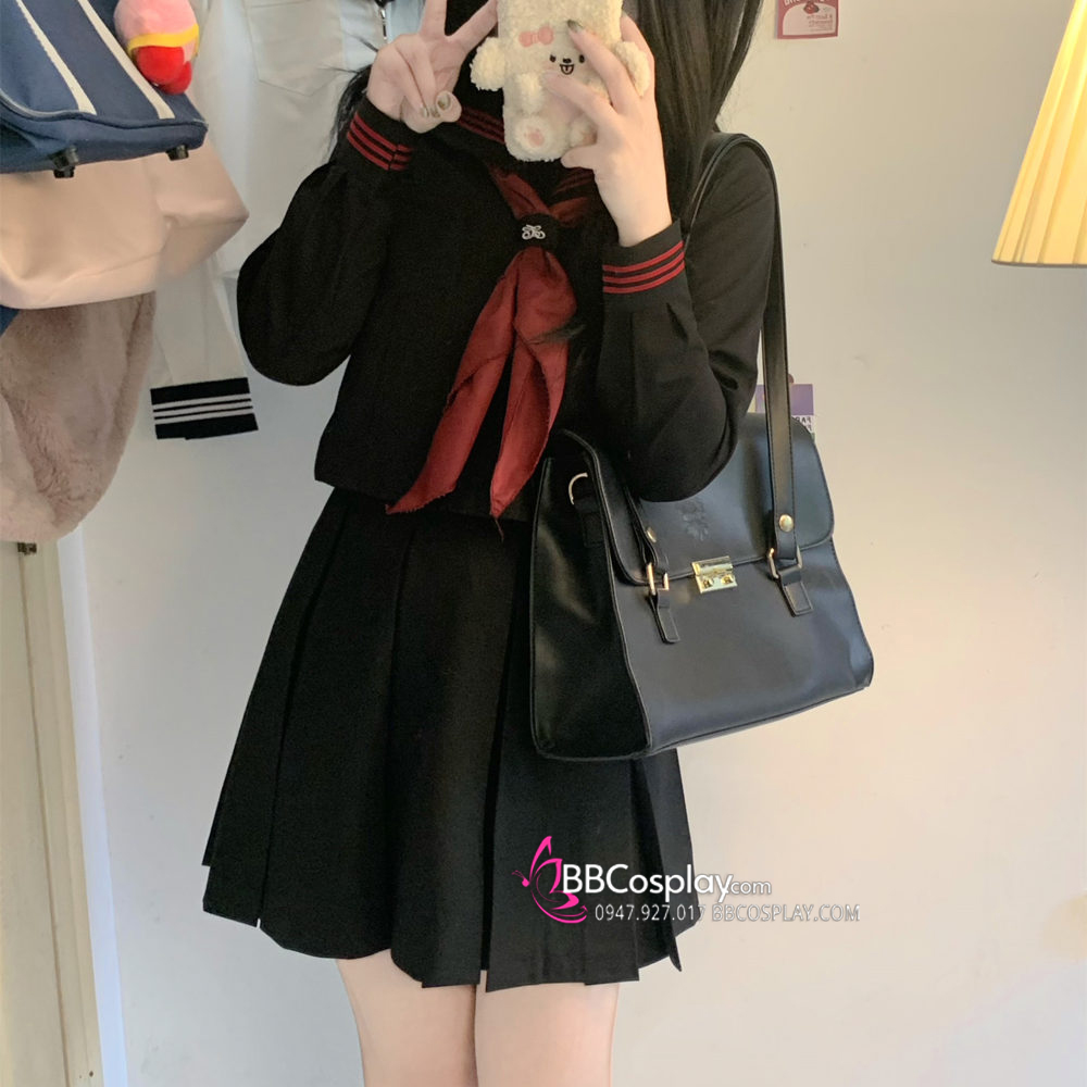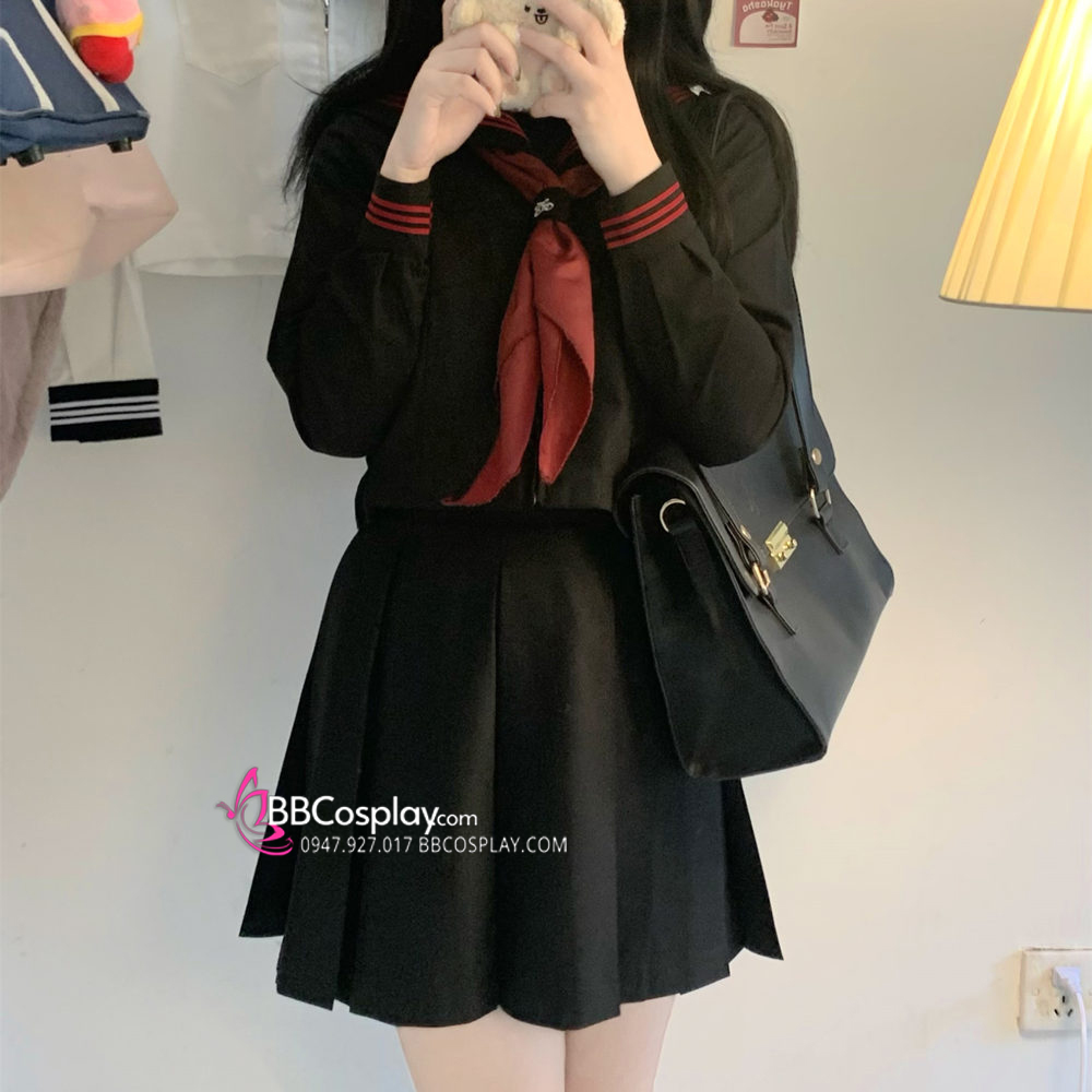 Đồng Phục Nữ Sinh Áo Đen Sọc Đỏ Tay Dài - Kèm Khăn Quàng Đỏ