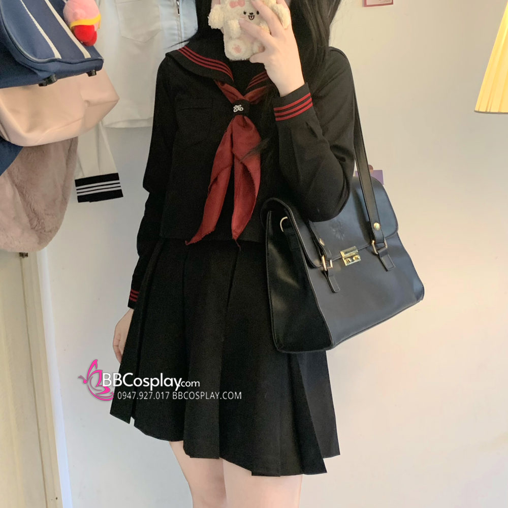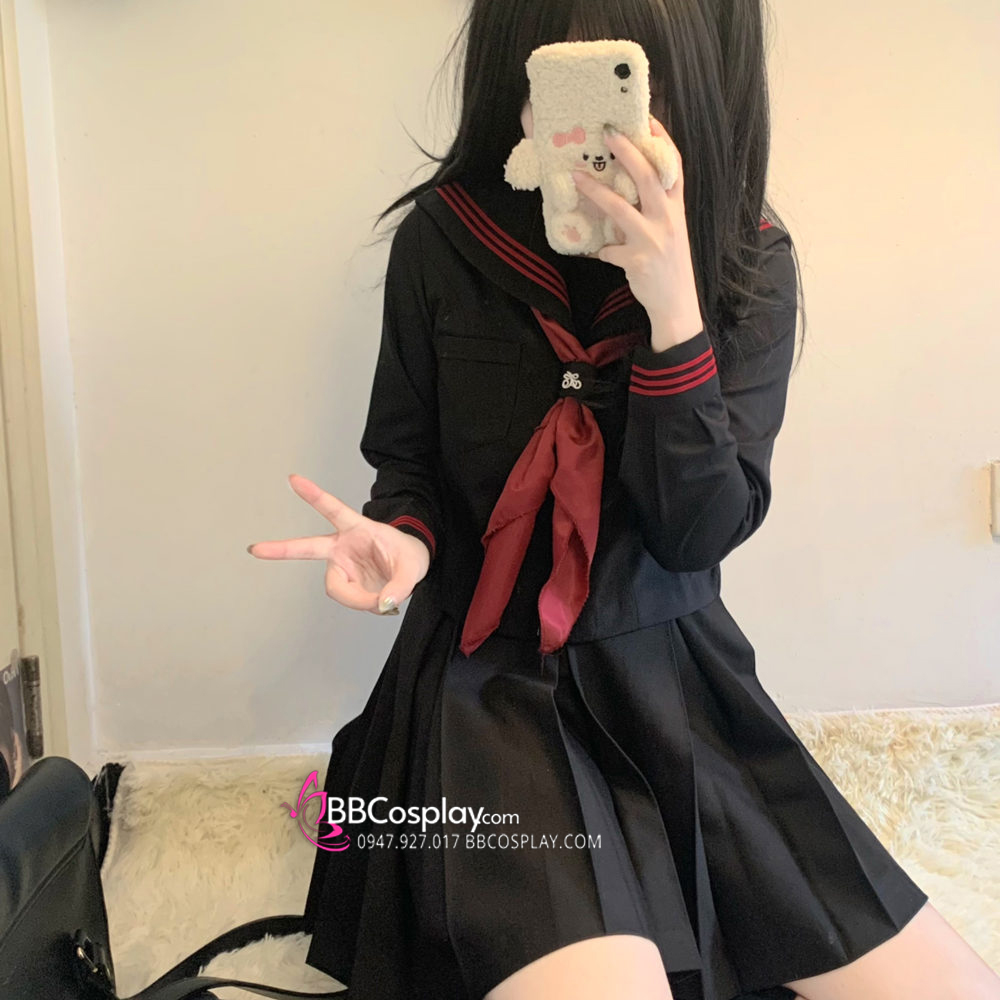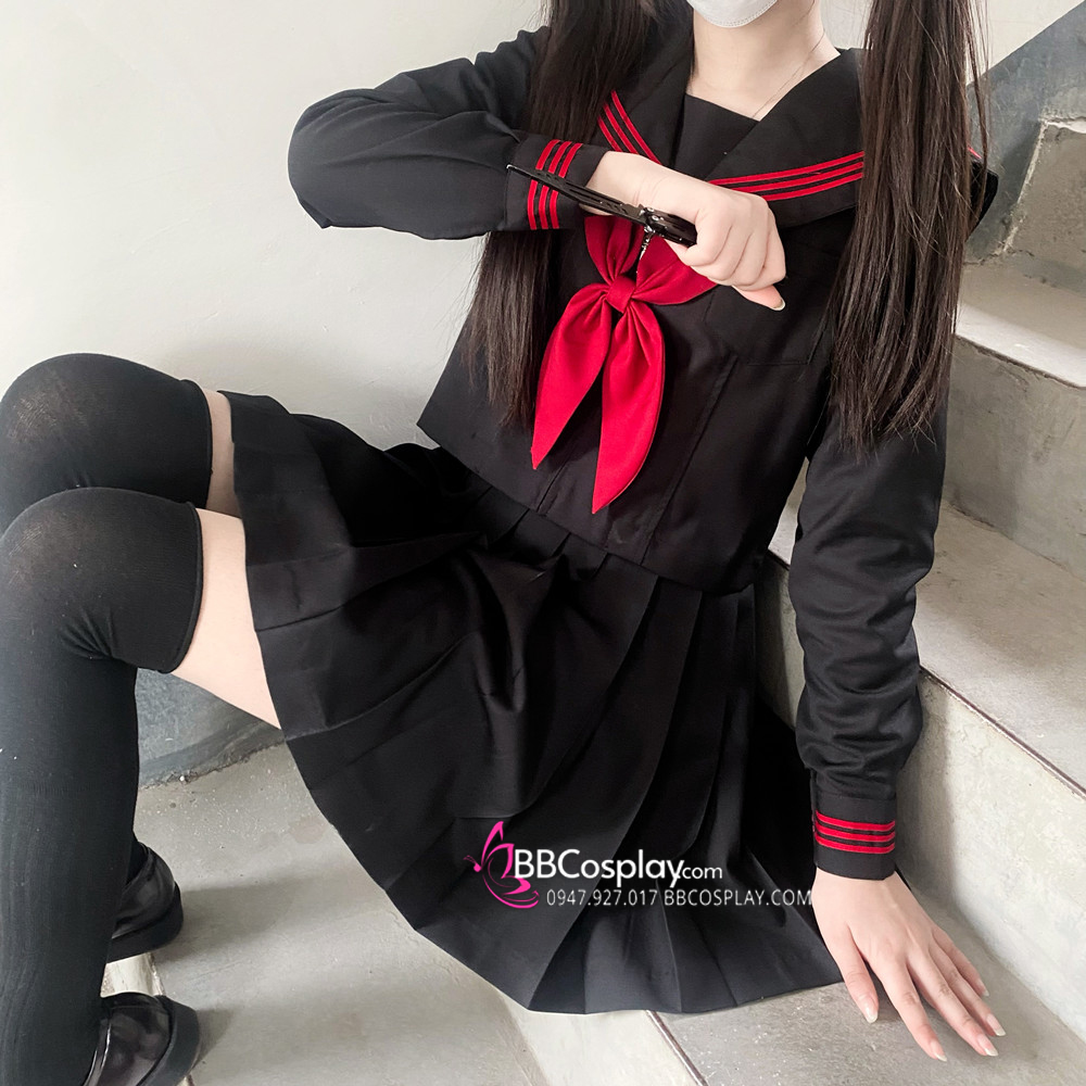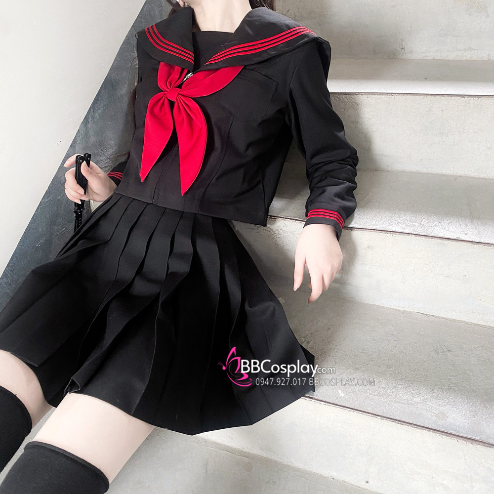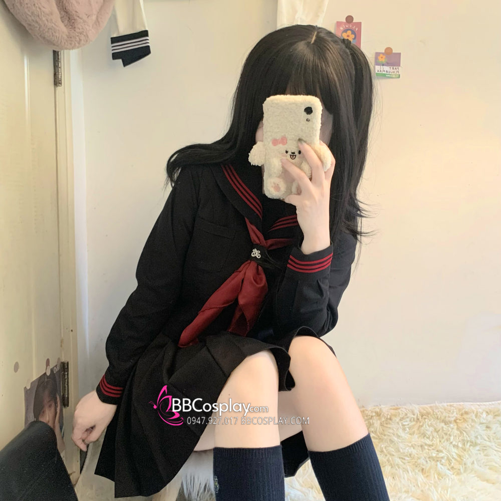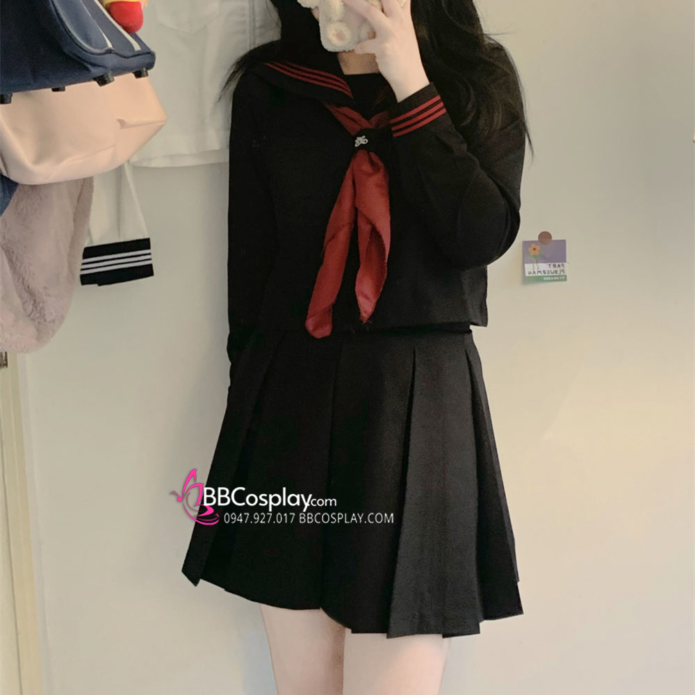 Đồng Phục Nữ Sinh Áo Đen Sọc Đỏ Tay Dài - Kèm Khăn Quàng Đỏ