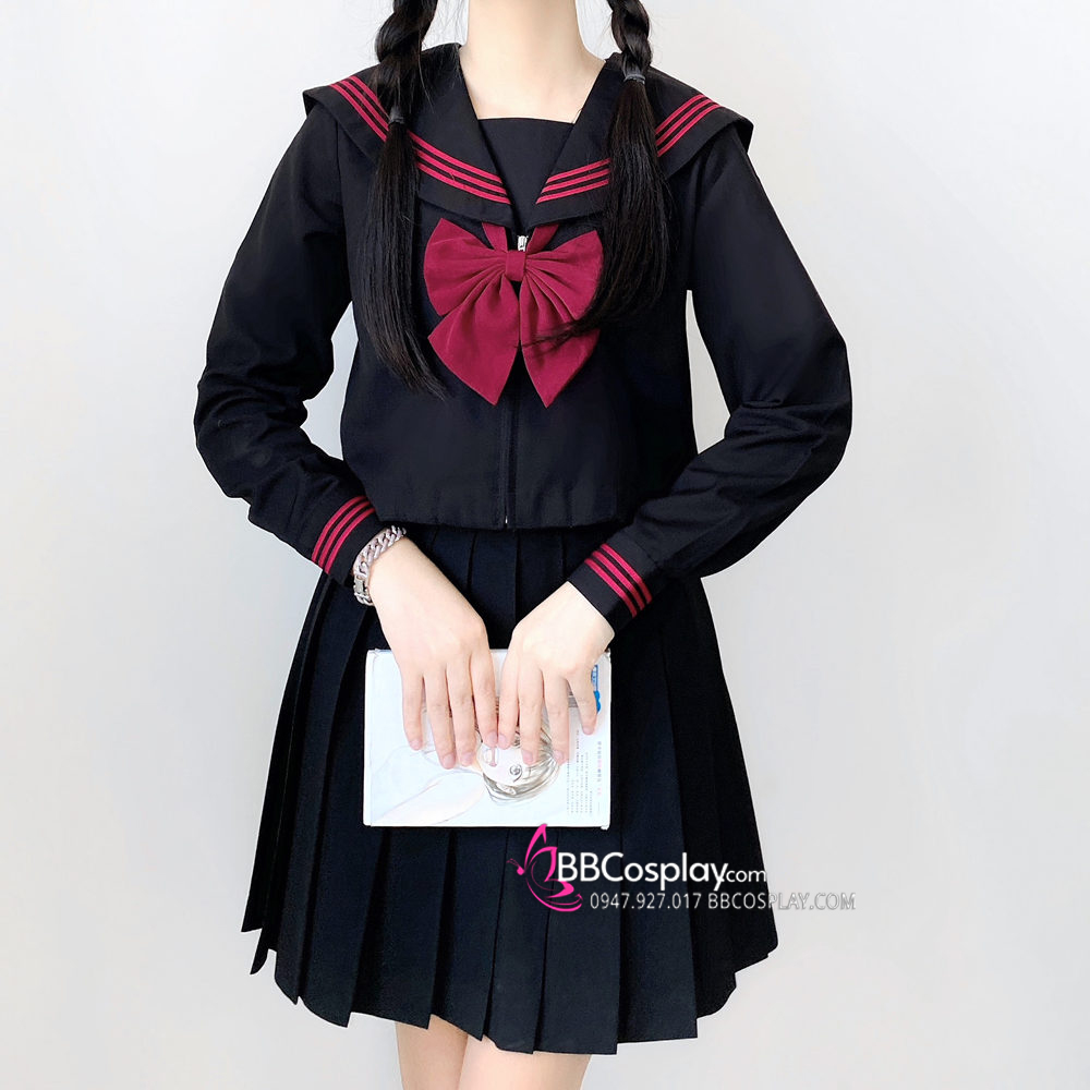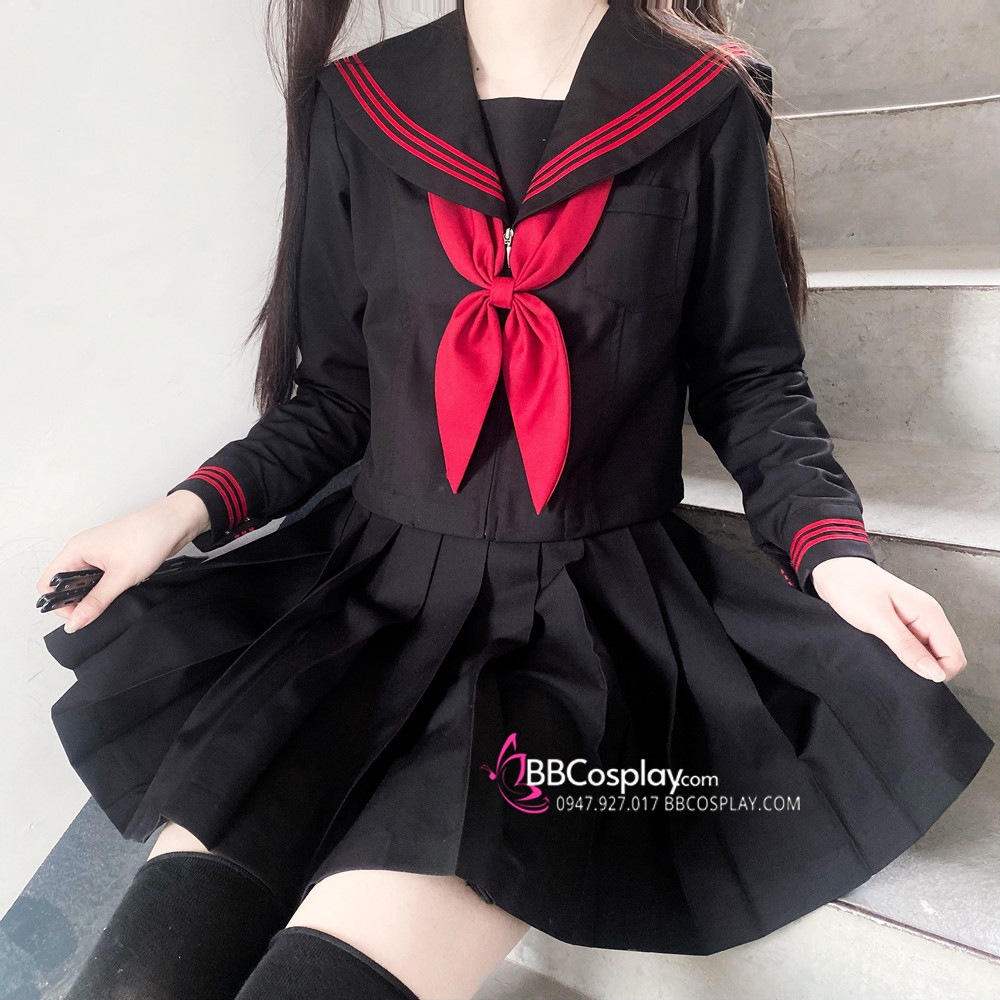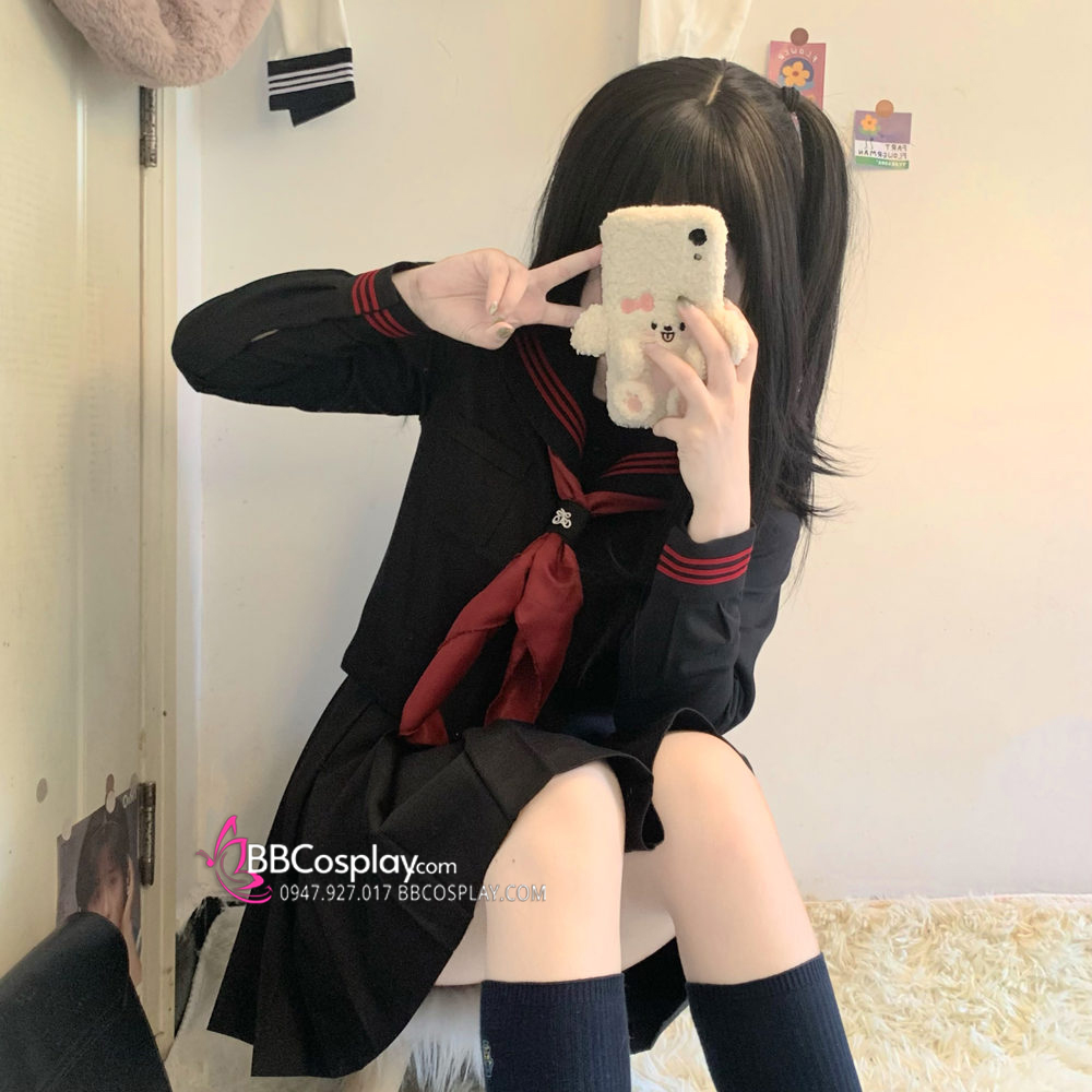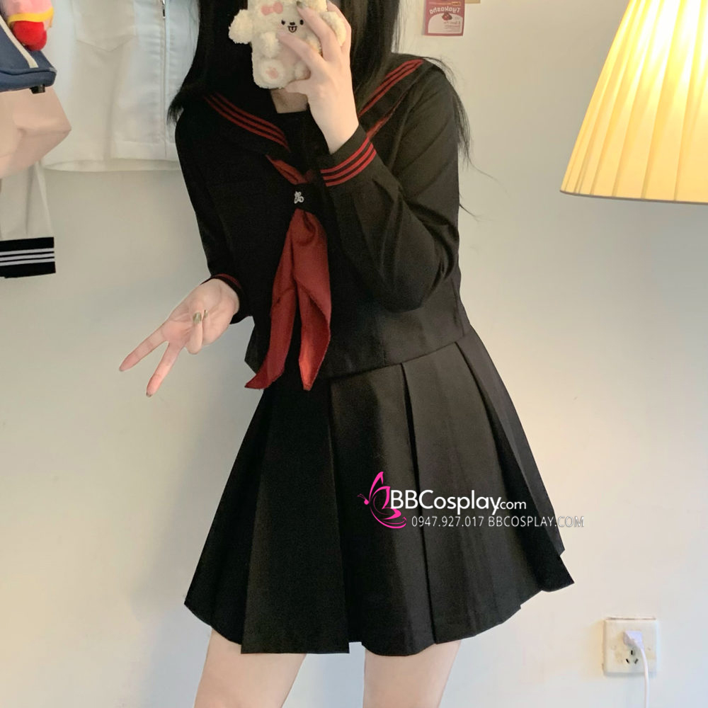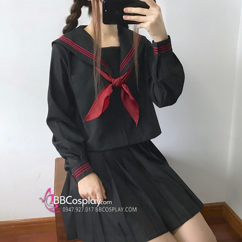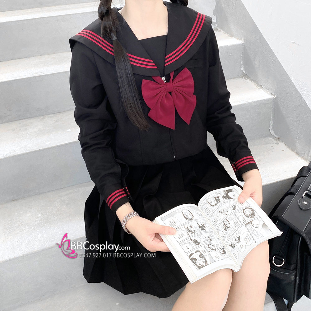 Đồng Phục Nữ Sinh Áo Đen Sọc Đỏ Tay Dài - Kèm Khăn Quàng Đỏ