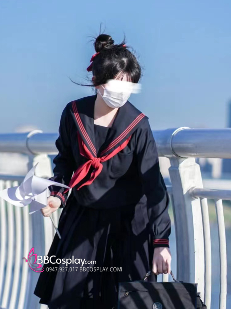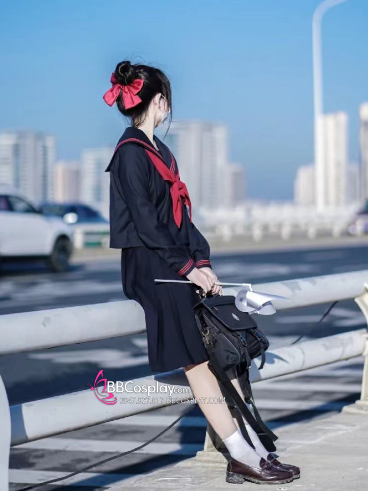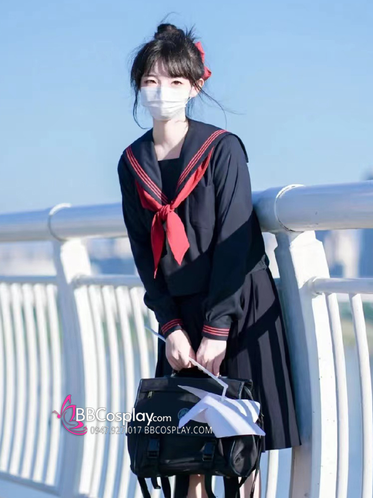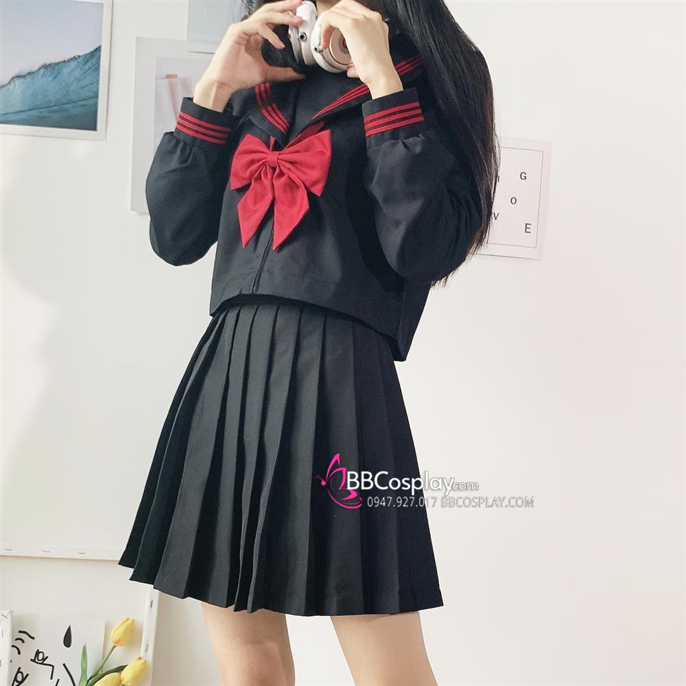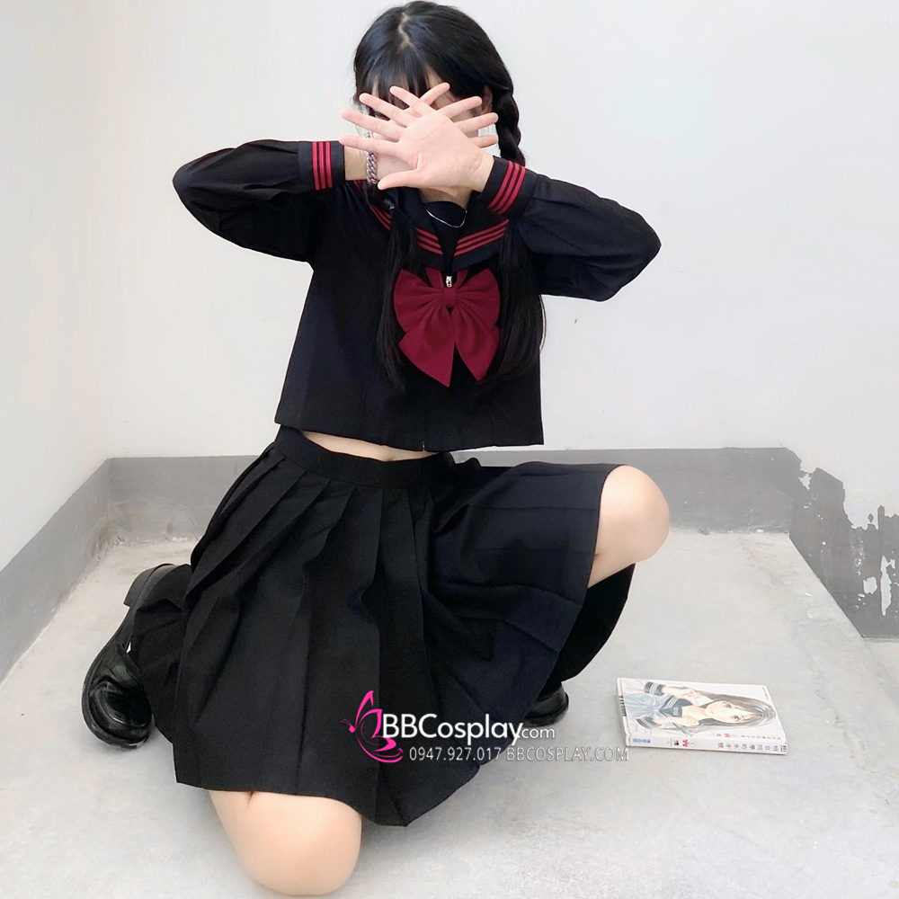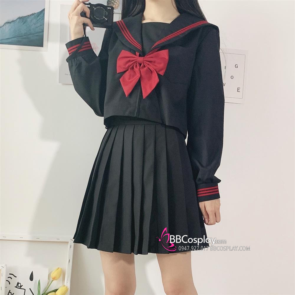 Đồng Phục Nữ Sinh Áo Đen Sọc Đỏ Tay Dài - Kèm Khăn Quàng Đỏ