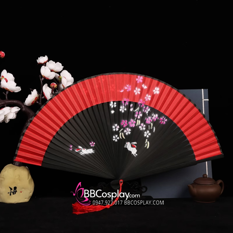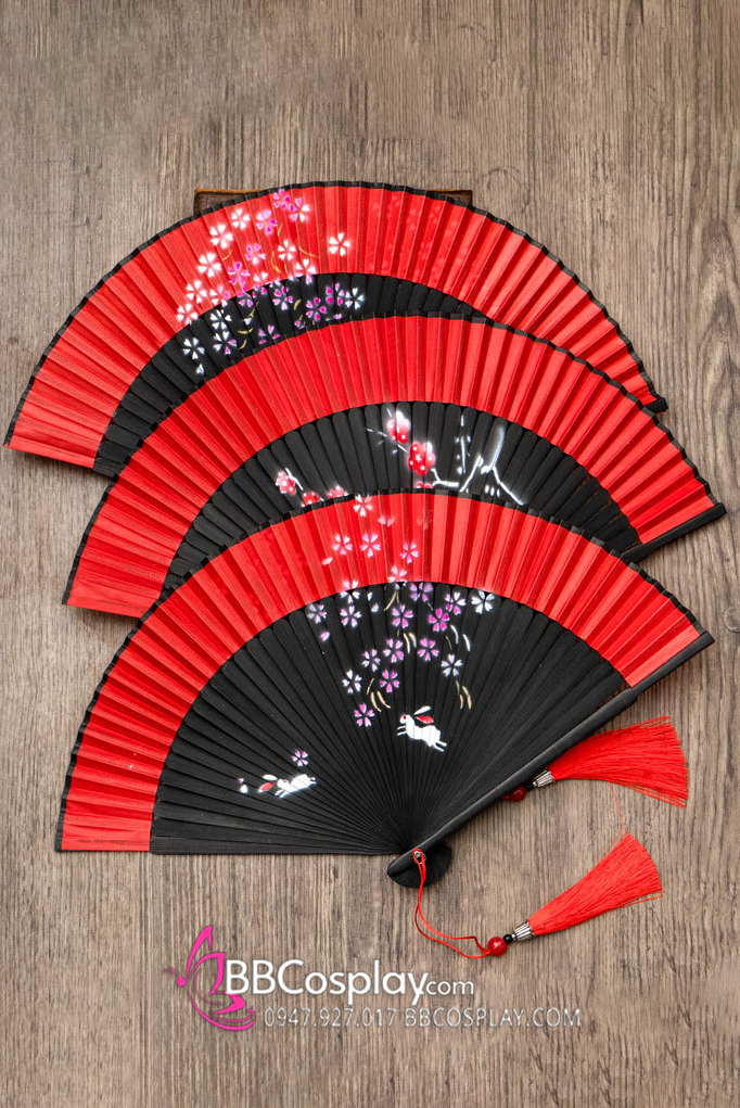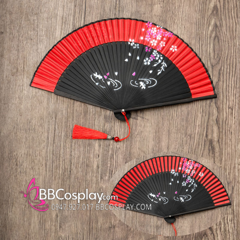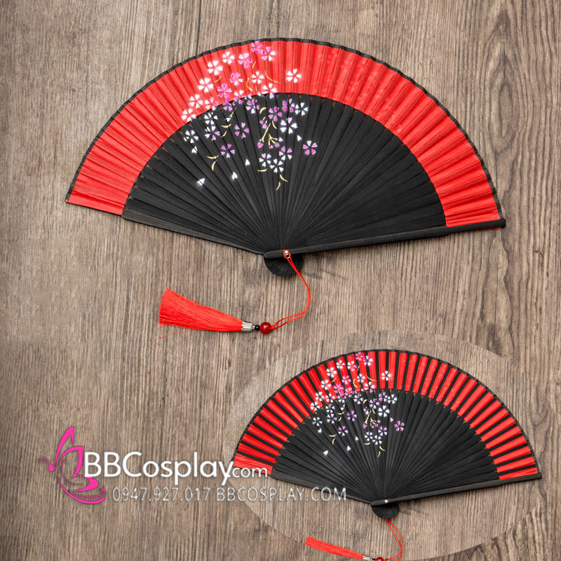 Quạt Xếp Uchiwa Vải Đỏ Cán Đen Loại Cao Cấp