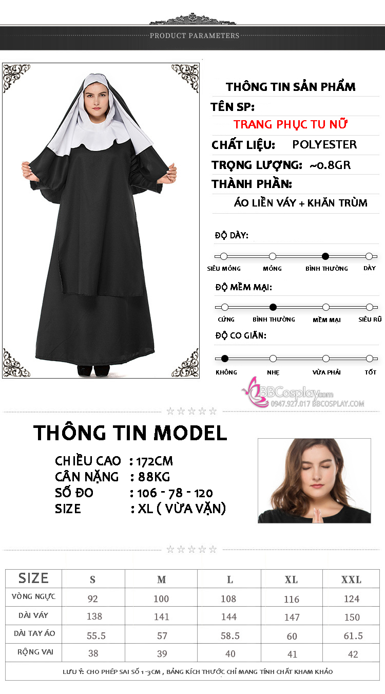 - Thành phần: áo đen dáng chữ A + trùm tóc may liền cổ