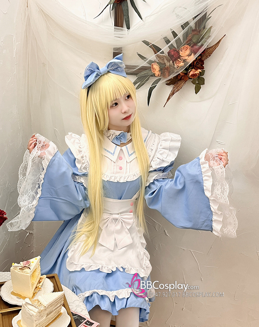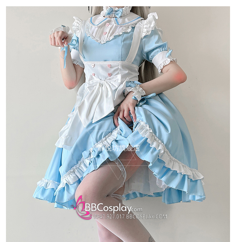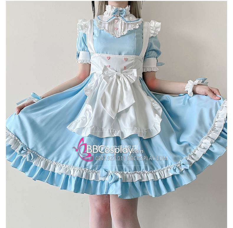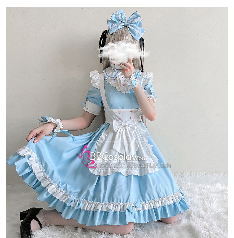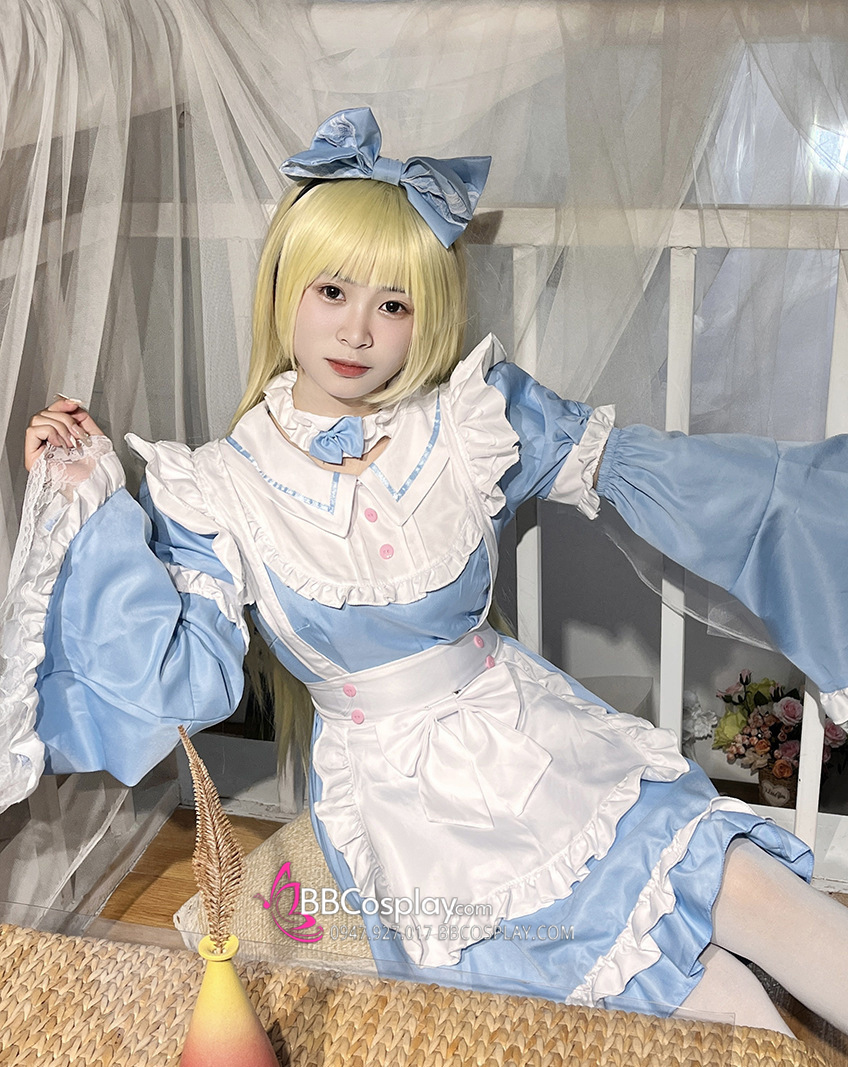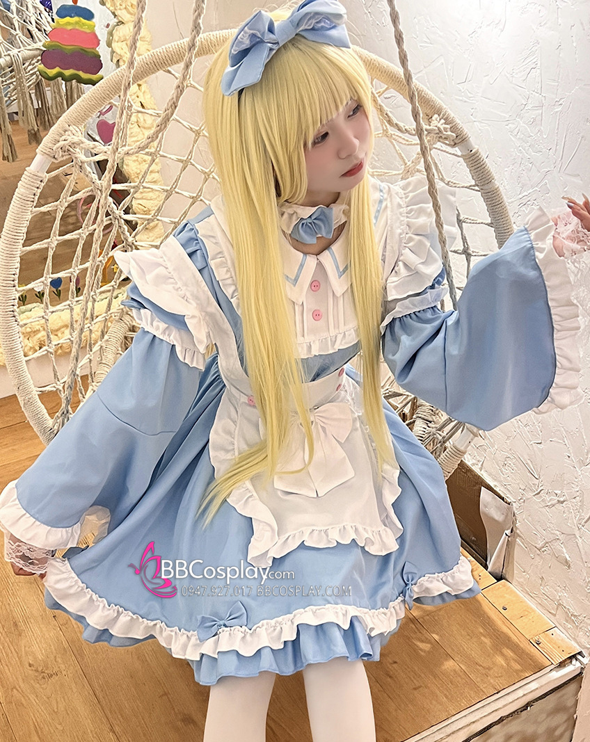 Đồ Nàng Hầu Maid Xanh Dương Tạp Dề Trắng Kèm Nhiều Nơ