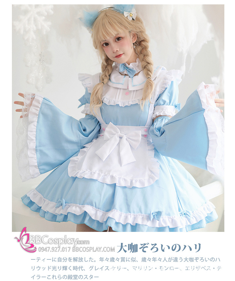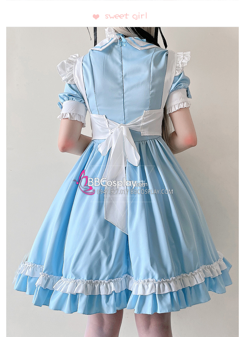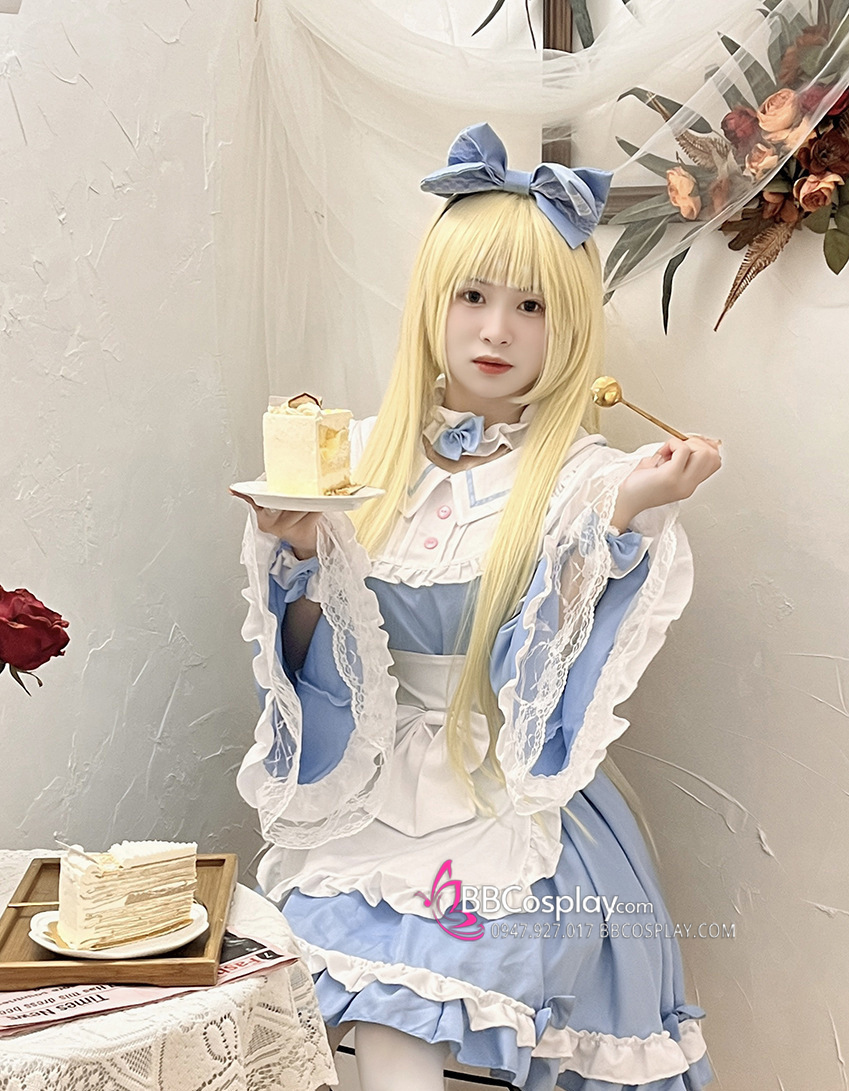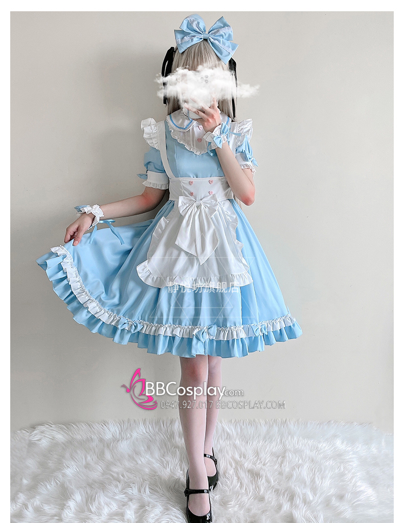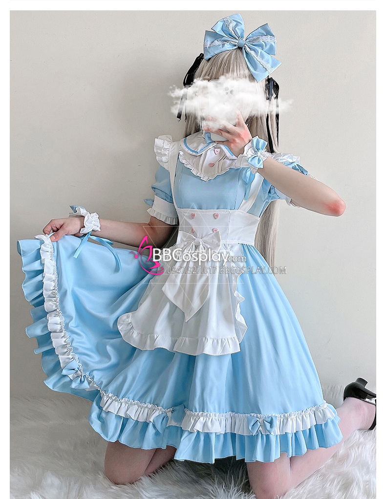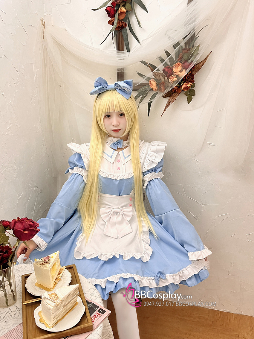 Đồ Nàng Hầu Maid Xanh Dương Tạp Dề Trắng Kèm Nhiều Nơ