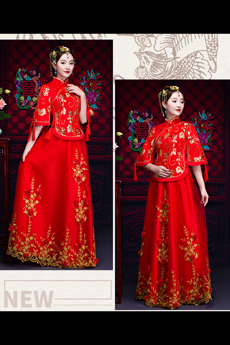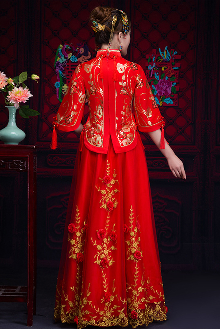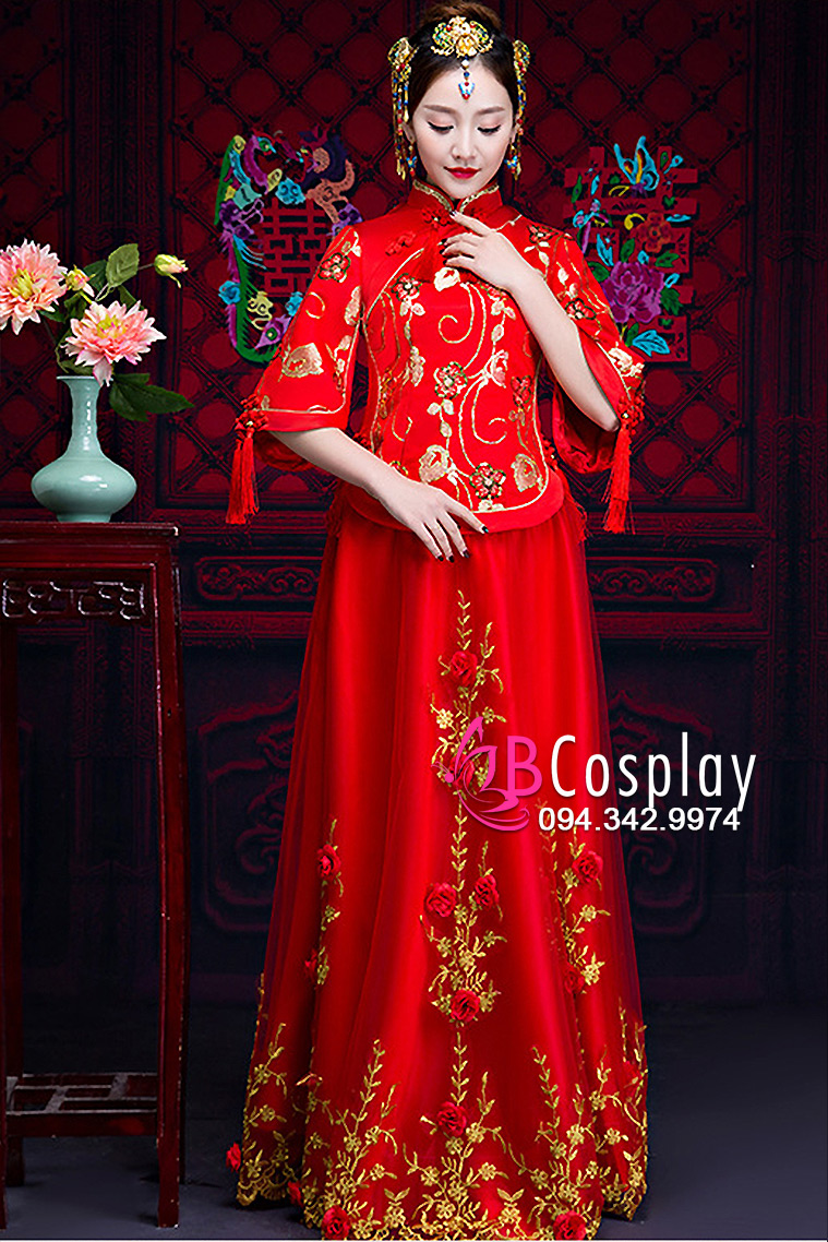 Bạn rất khó tìm thấy Hỉ Phục Hồng Hoa Nương Tử nào độc đáo và chất lượng như tại BBCosplay. Bộ hỉ phục gồm áo gấm, váy có 2 lớp với lớp lót là phi bóng, lớp ngoài voan và toàn bộ chi tiết được thêu hoa bằng chỉ vàng. Đặc biệt hơn nữa, phần chân váy còn được đính hoa hồng, tạo nên nét kiêu sa, lộng lẫy cho mọi cô dâu khi sở hữu nó.