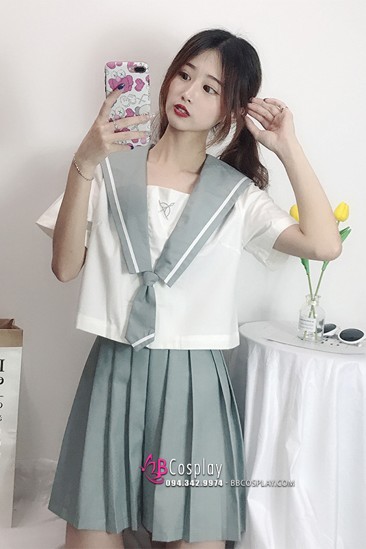 Trang Phục Nữ Sinh Nhật Áo Trắng Tay Ngắn Váy Xanh Xám