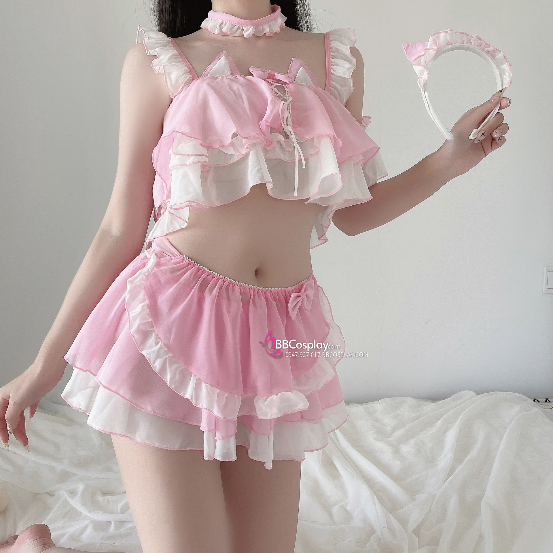 Đồ Nàng Hầu Maid Hồng Tạp Dề Trắng Kèm Nhiều Nơ