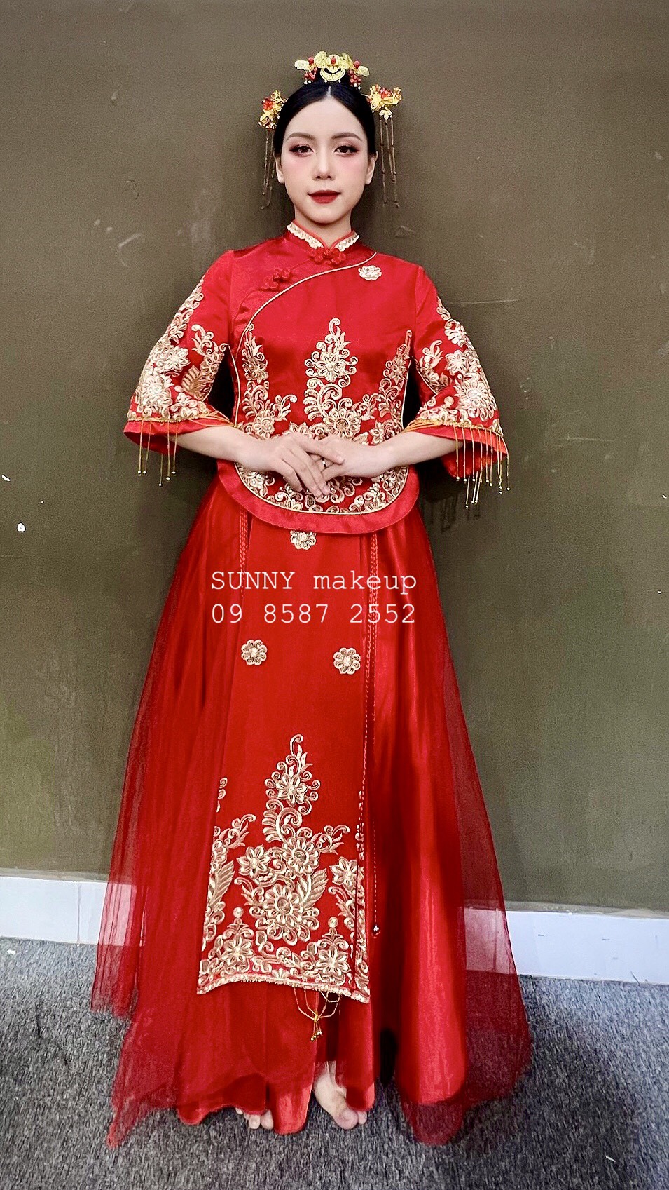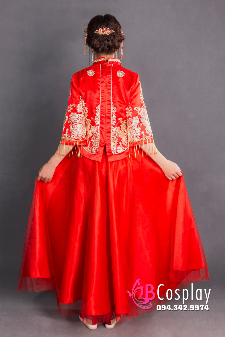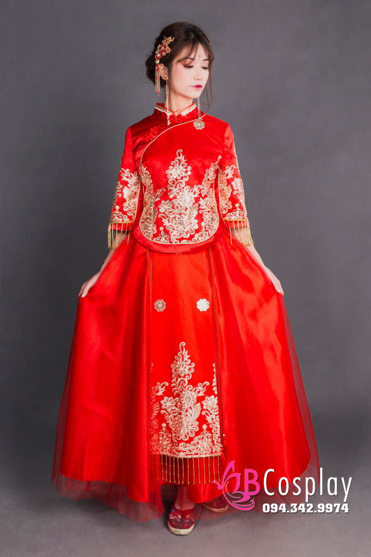 Hỷ phục nữ đính cườm được may từ voan trên nền phi, có rất nhiều chi tiết thêu hoa, rồng phụng tinh xảo từ chỉ vàng. Nhưng tất cả được tiết chế và nhất nhá rất hợp lý. Trong sang trọng lắp lánh, nhưng không quá phô trương. Toàn bộ trang phục sẽ hoàn hảo hơn khi nếu bạn thuê mua thêm trâm cài tóc, giày... tại BBCosplay.