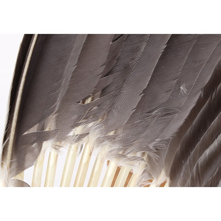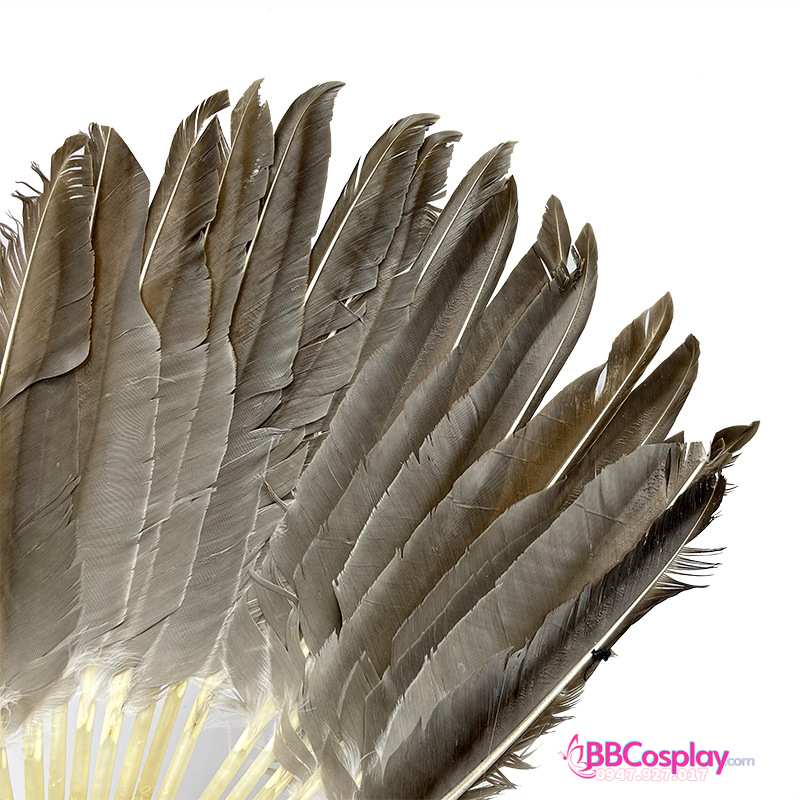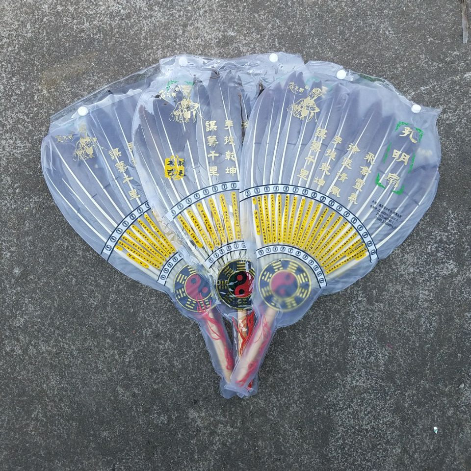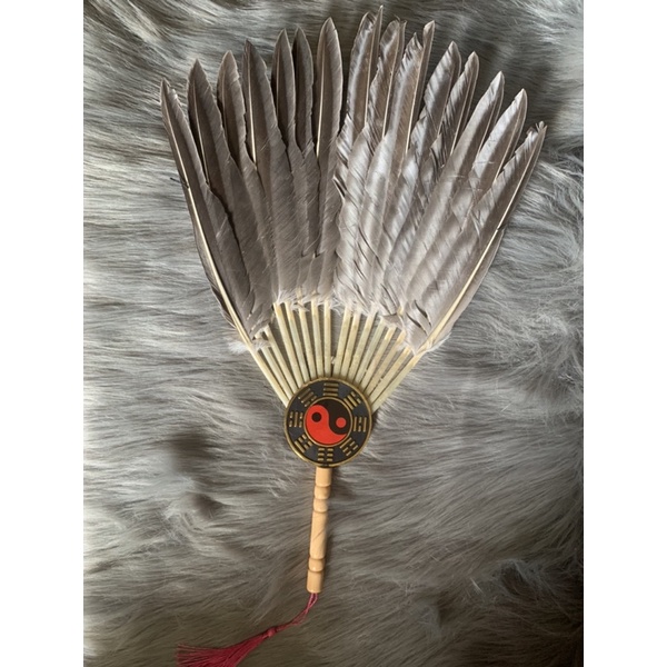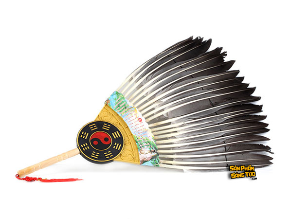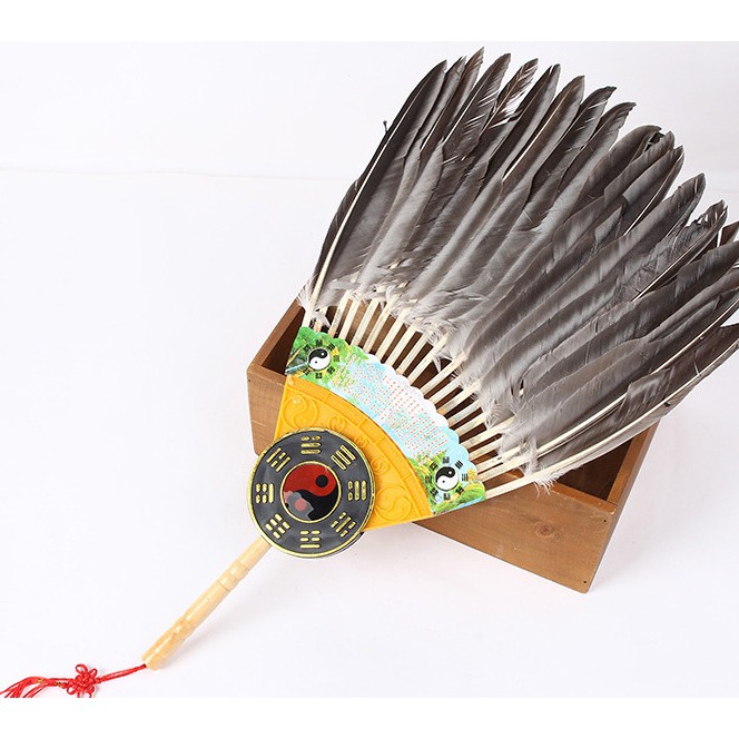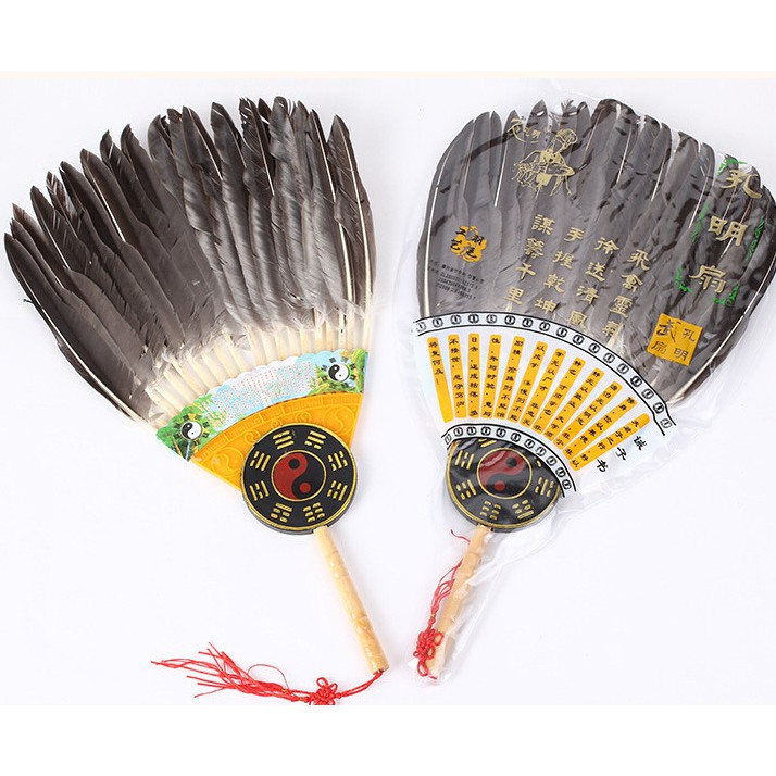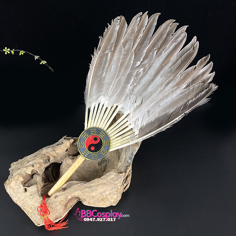 - Chất liệu: Cán nhựa giả gỗ. Được làm bằng lông ngỗng cứng cáp, có gắn bát quái dưới chuôi khiến cho chiếc quạt trông giống thời xuân thu chiến quốc.