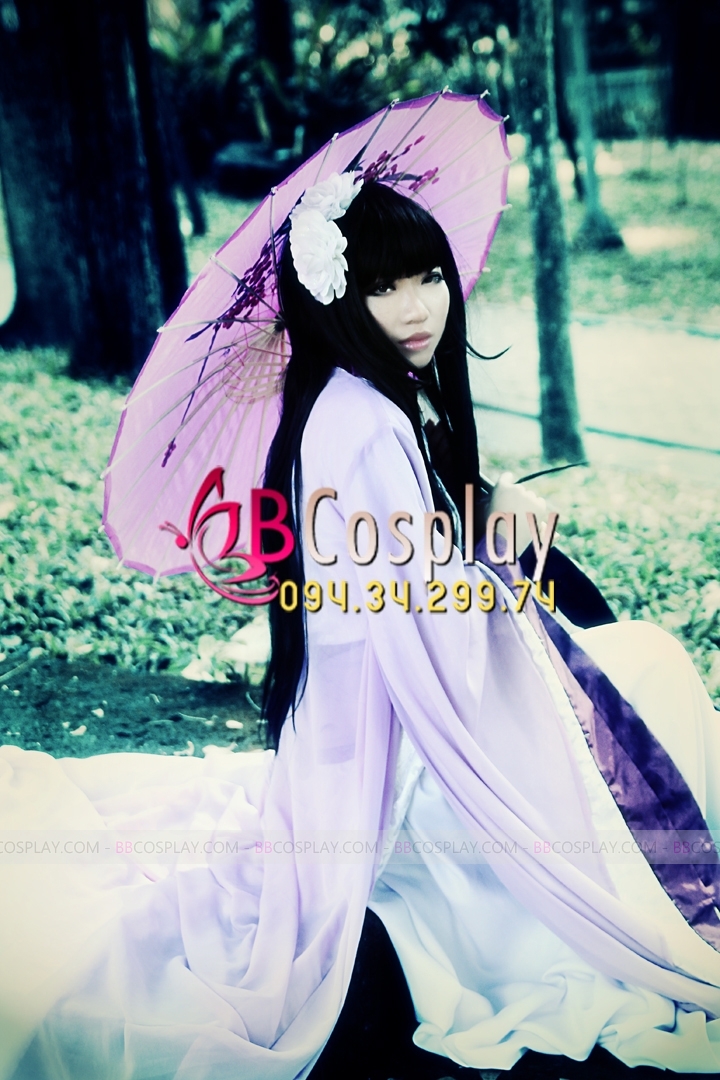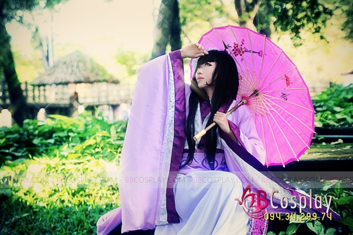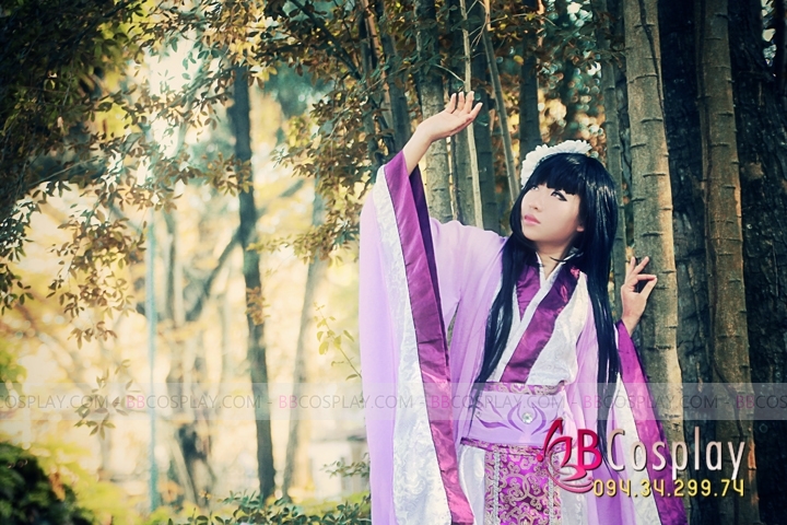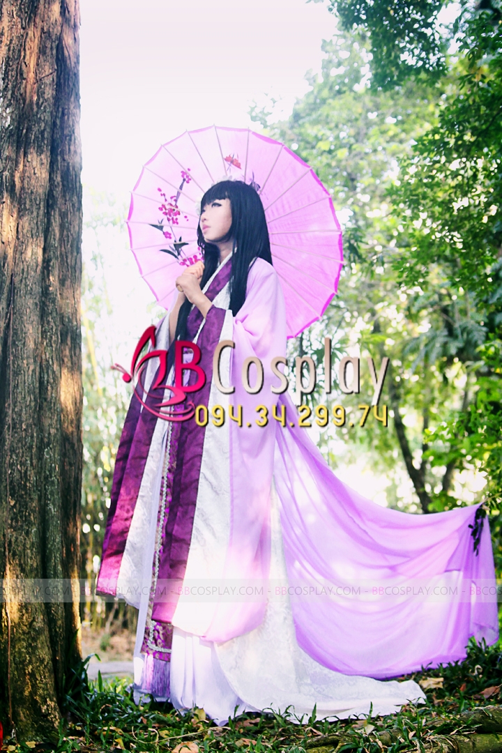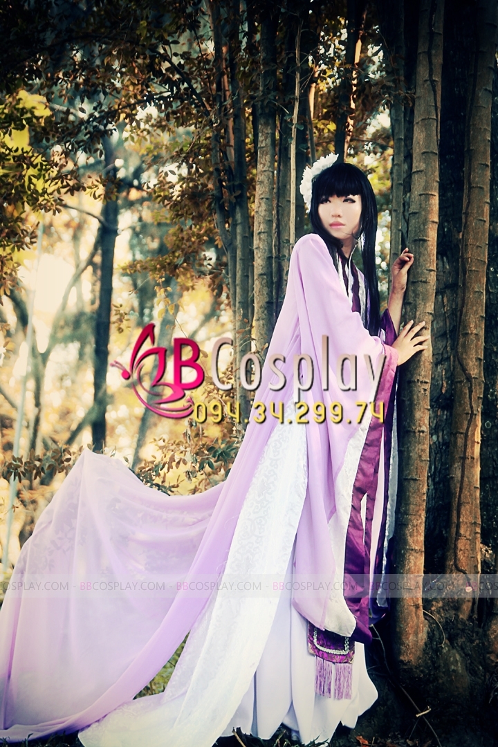 áo yếm phi tím + váy phi dài + lớp áo gấm trắng viền tím dài + áo choàng voan nhung tím dài + đai gấm tím dài