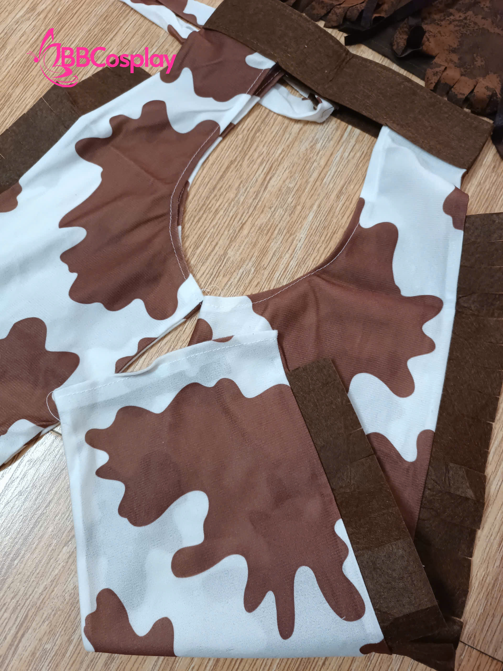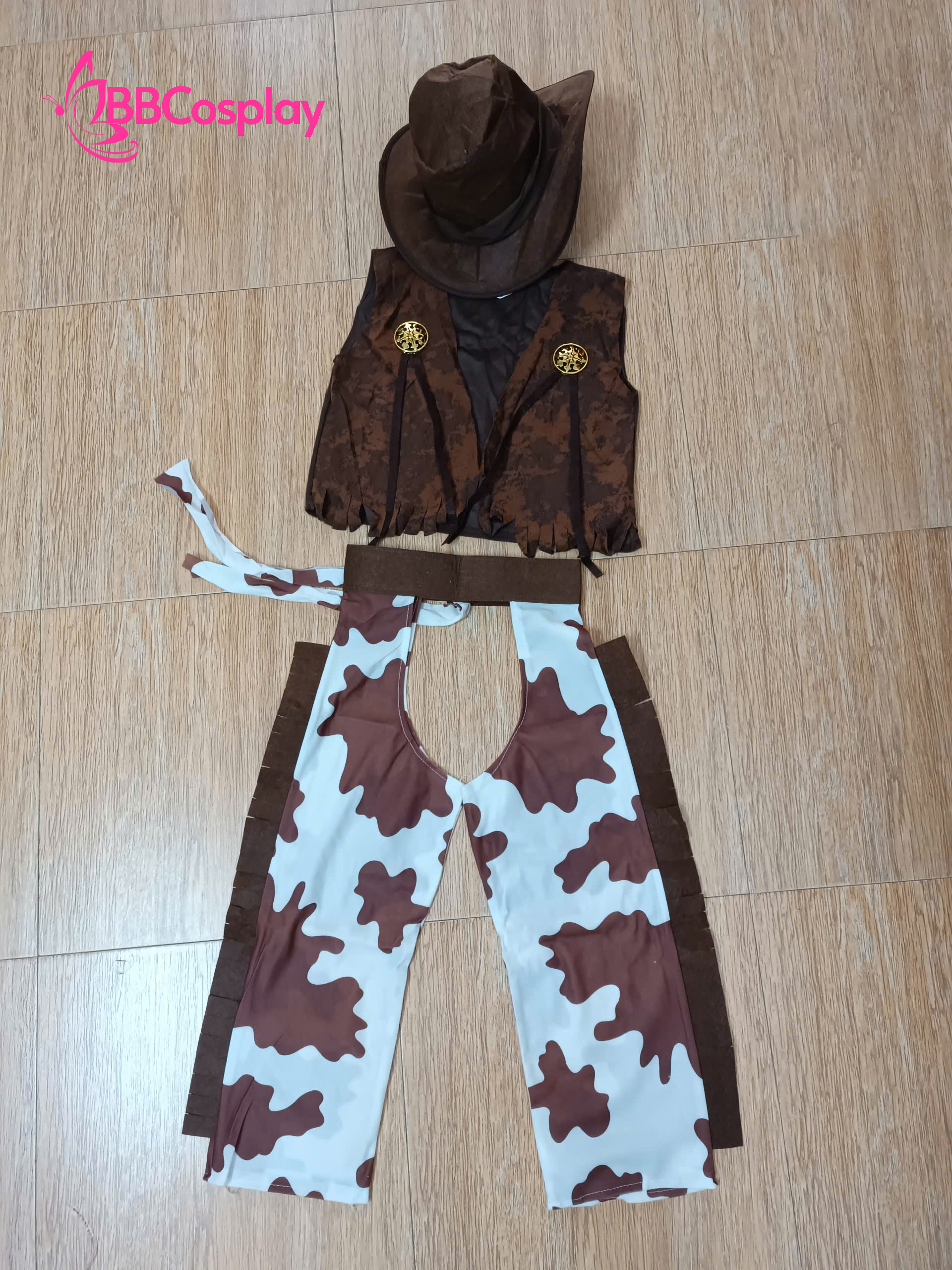 - Thành phần: gilê màu nâu giả da bò + quần giả vân bò + khăn đỏ cột cổ + nón cao bồi vải nỉ