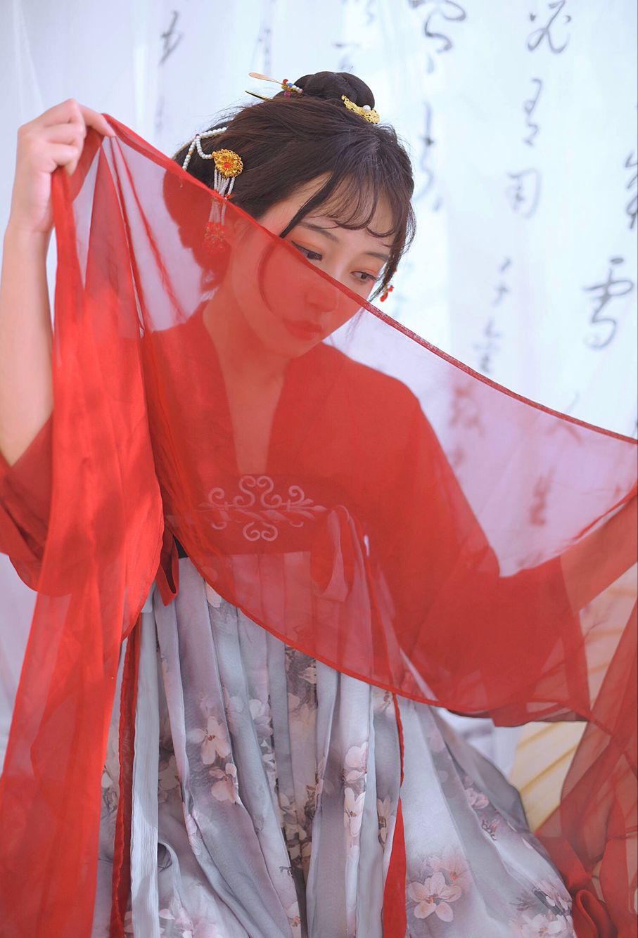 Áo trên + váy ngang ngực + voan tay, tặng kèm: dãy lụa cột tóc + quạt + 1 trâm cày tóc