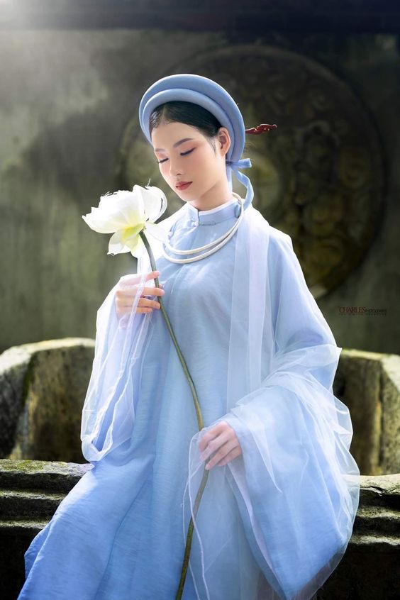 Áo Ngũ Thân Xanh Lơ Chất Tơ Có Khoác Voan