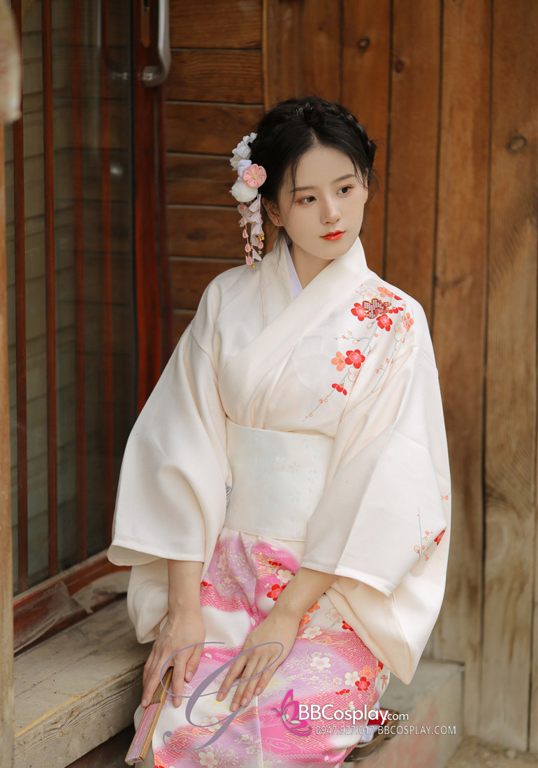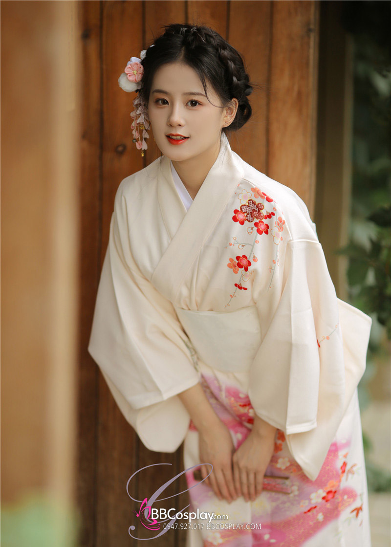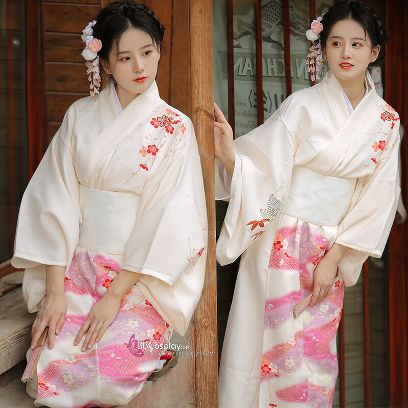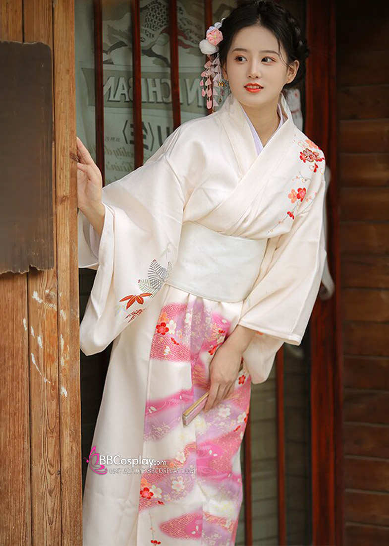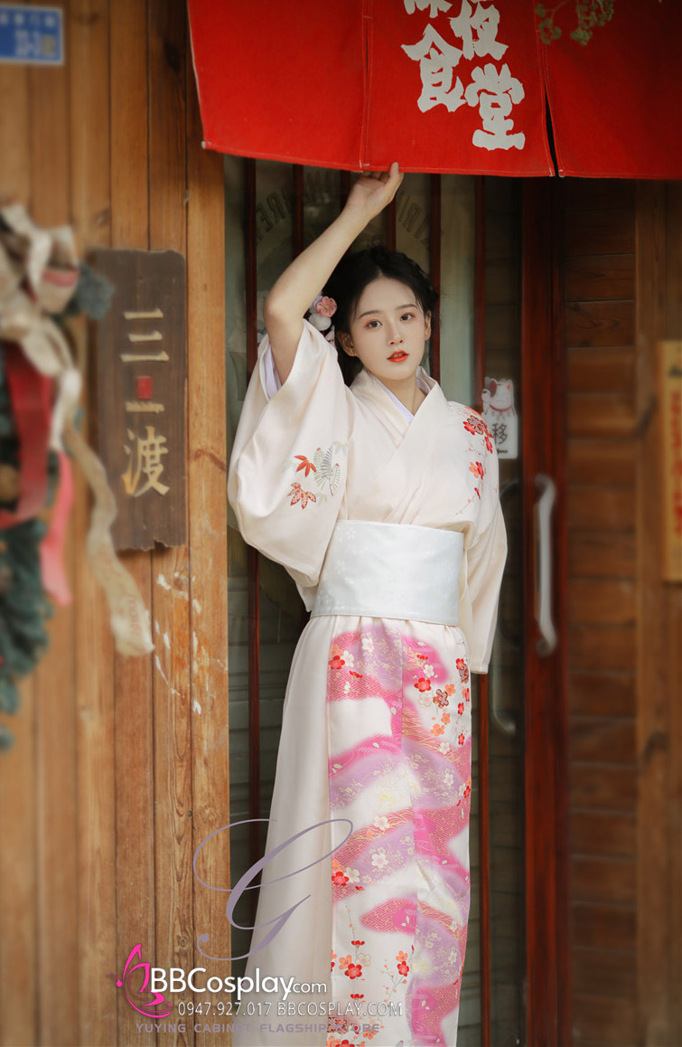 Áo Yukata Kimono Trắng Kem Tặng Kèm Thắt Lưng
