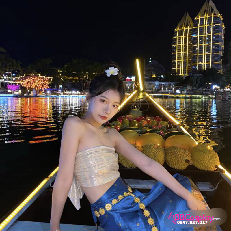 Đồ Thái Lan Sexy Áo Trắng - Váy Xanh Dương Viền Gấm
