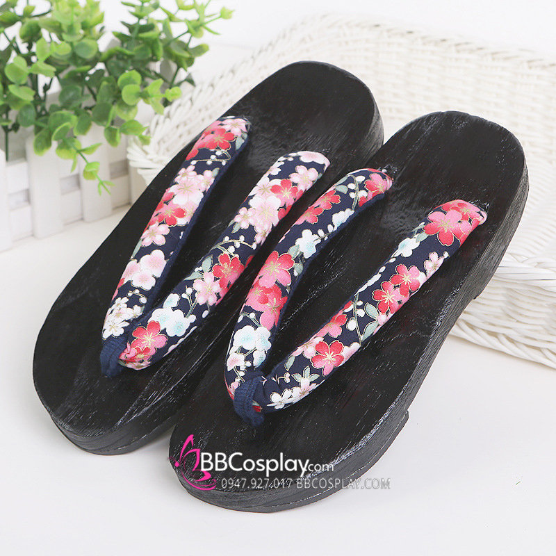Guốc Gỗ Geta Bản Gỗ Đen Đế Thấp Quai Hoa
