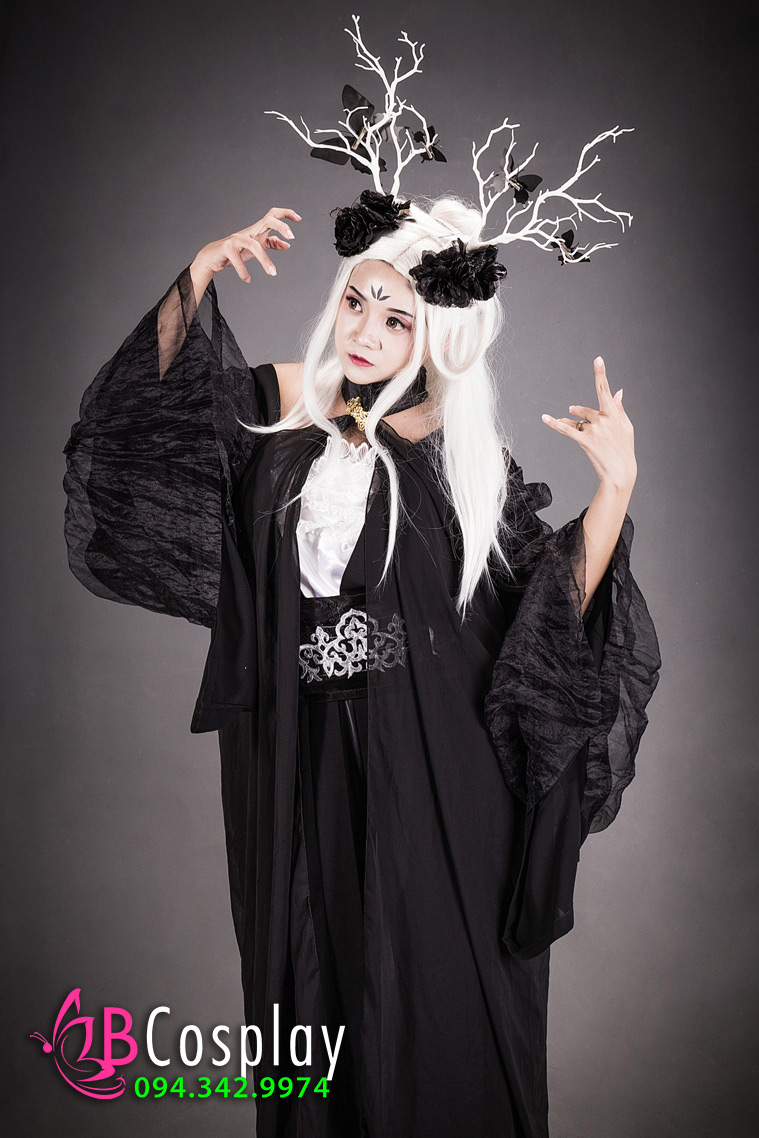 yếm ren trắng + áo voan nhung đen + voan kính đen + váy + khoác nữ thần + đai + sừng