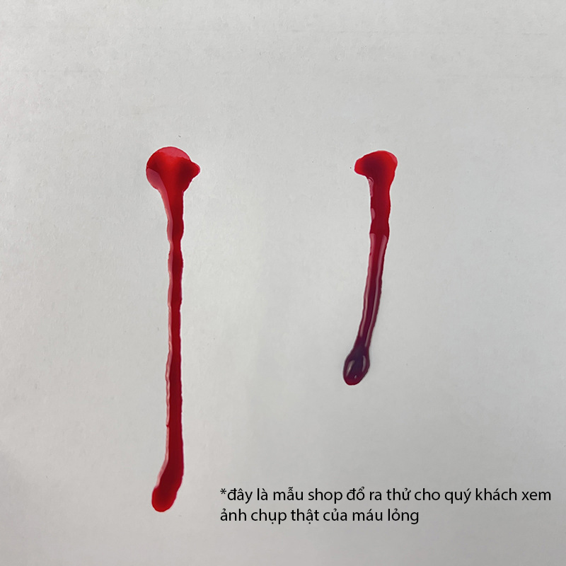 - Với loại máu lỏng: bạn dễ dàng bôi lên quần áo, nhưng khá lỏng và dễ chảy khi bôi lên da. Bôi lên da, khó tạo hình hơn máu đặc. Máu lỏng có thể dùng để rẩy, tưới, phun, vãy khắp nơi, khắp phòng. Có thể vãy máu lỏng lên kính và lau chùi bình thường, không bám màu trên kính!