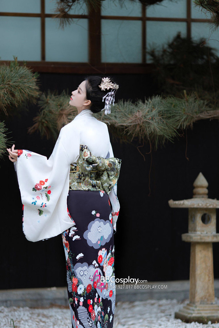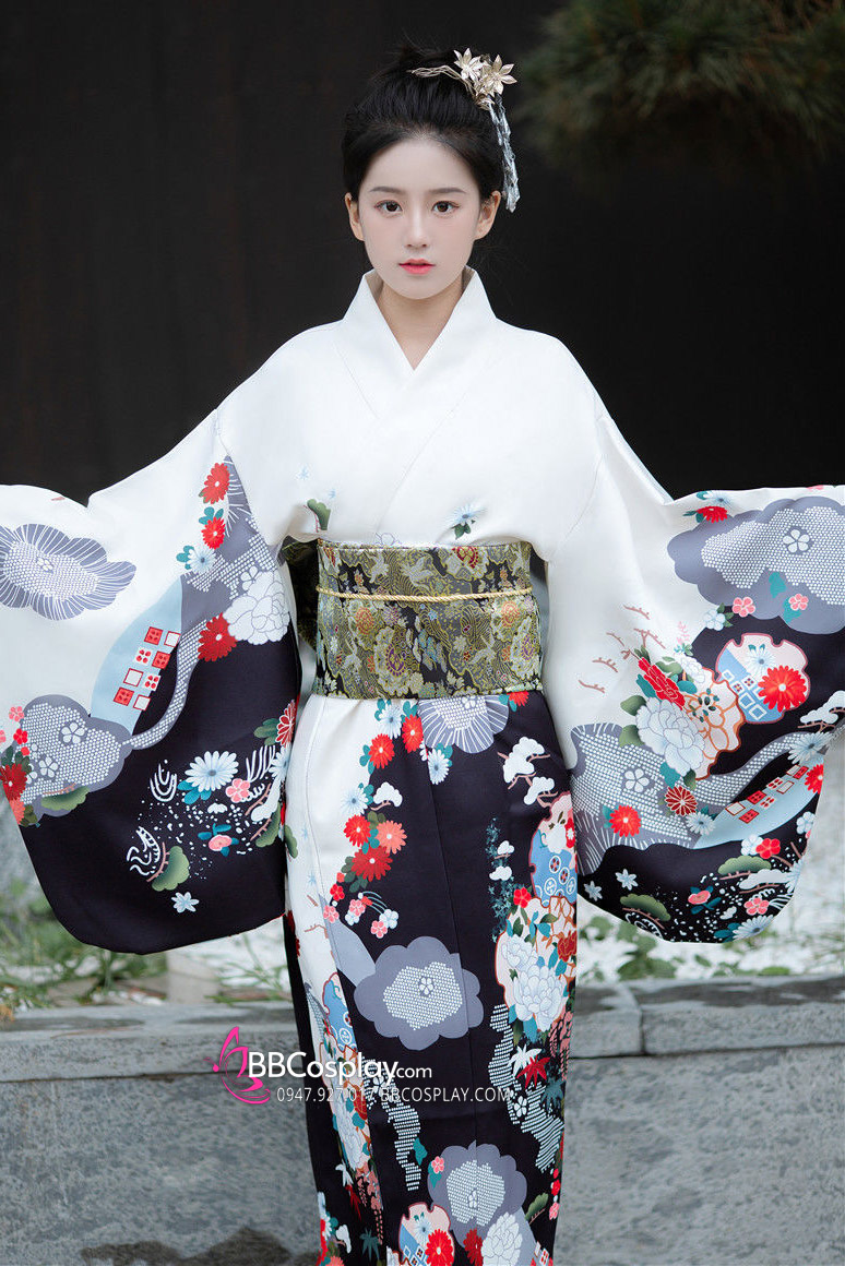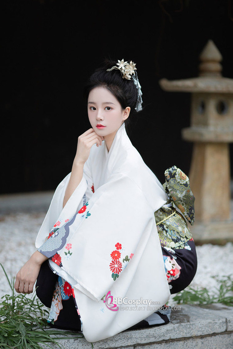 Áo Yukata Trắng Chân Đen Tặng Kèm Thắt Lưng