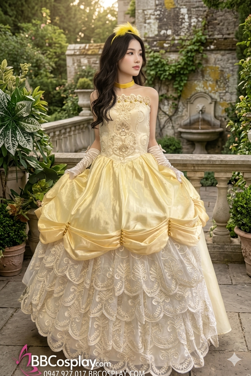 ( set nữ)đầm vàng + tùng phồng + vòng cổ + cài tóc + găng tay trắng