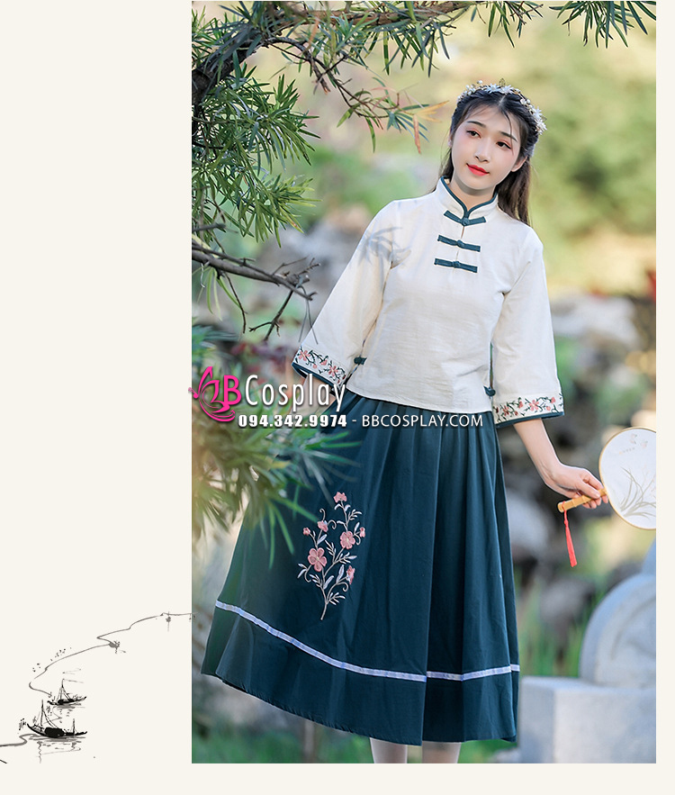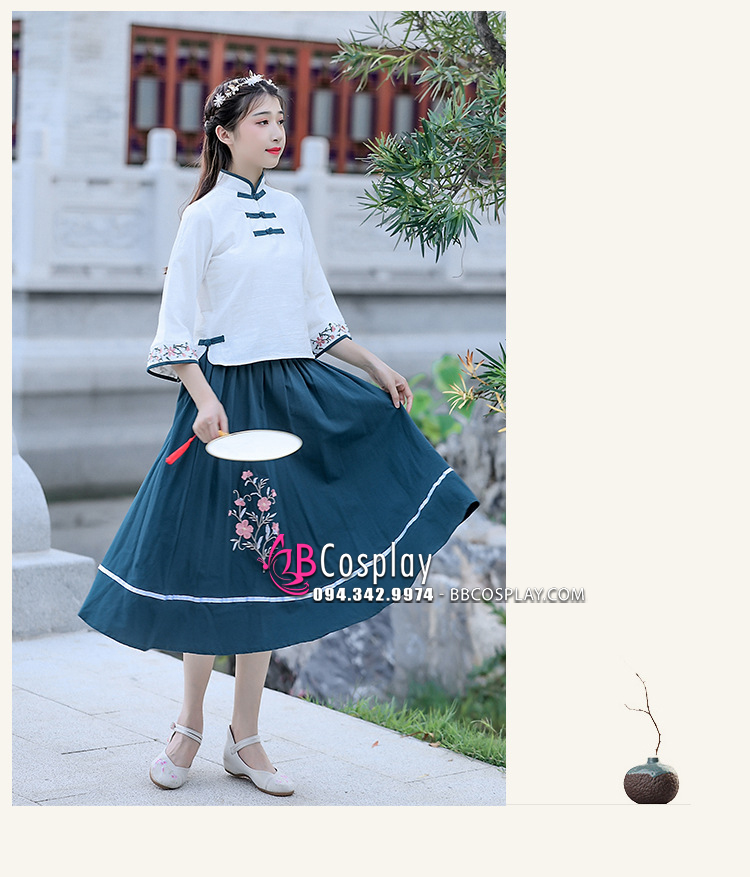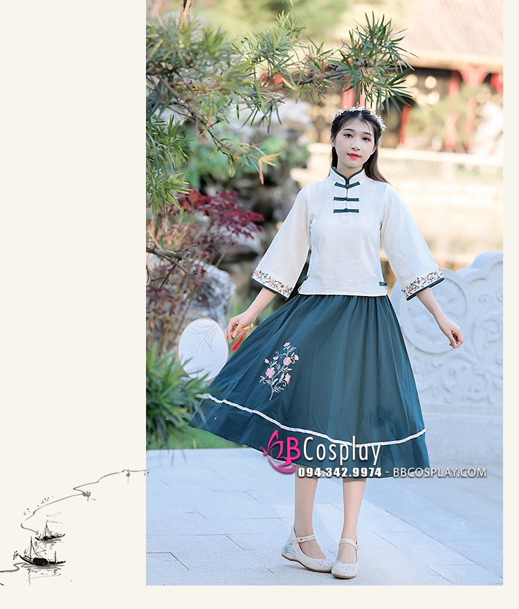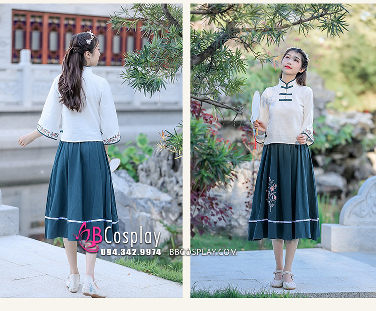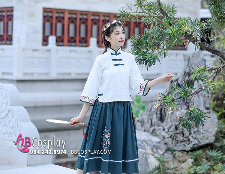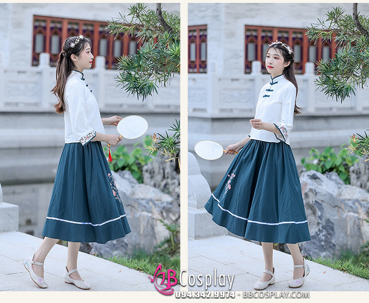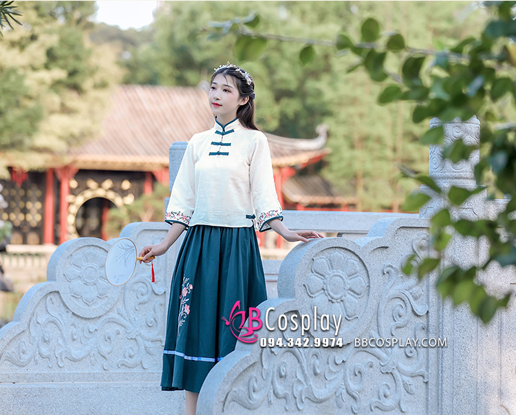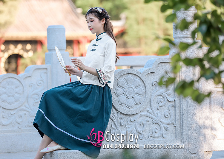 Trang Phục Hằng Nga Cổ Tàu Áo Trắng Váy Xanh