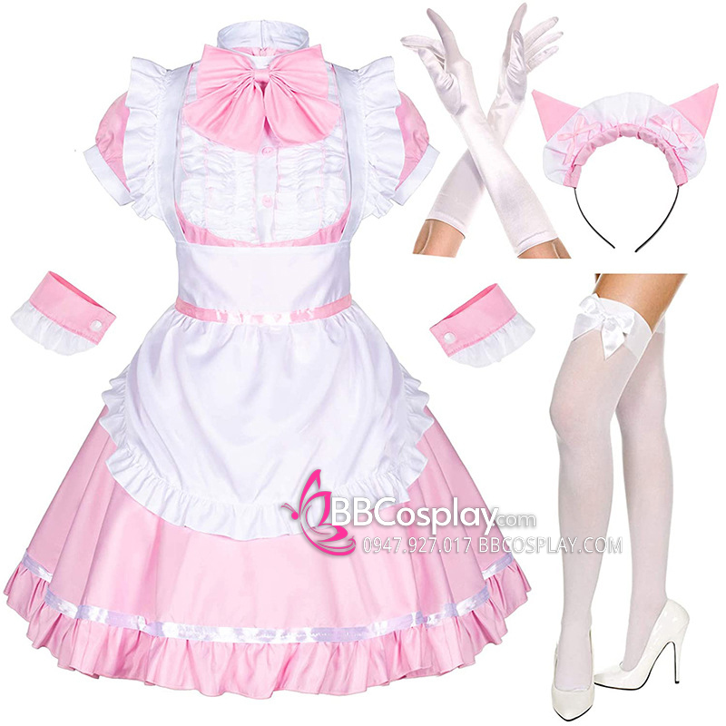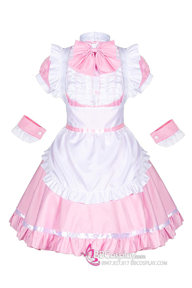 Đồ Nàng Hầu Maid Hồng Tạp Dề Trắng Kèm Nhiều Nơ