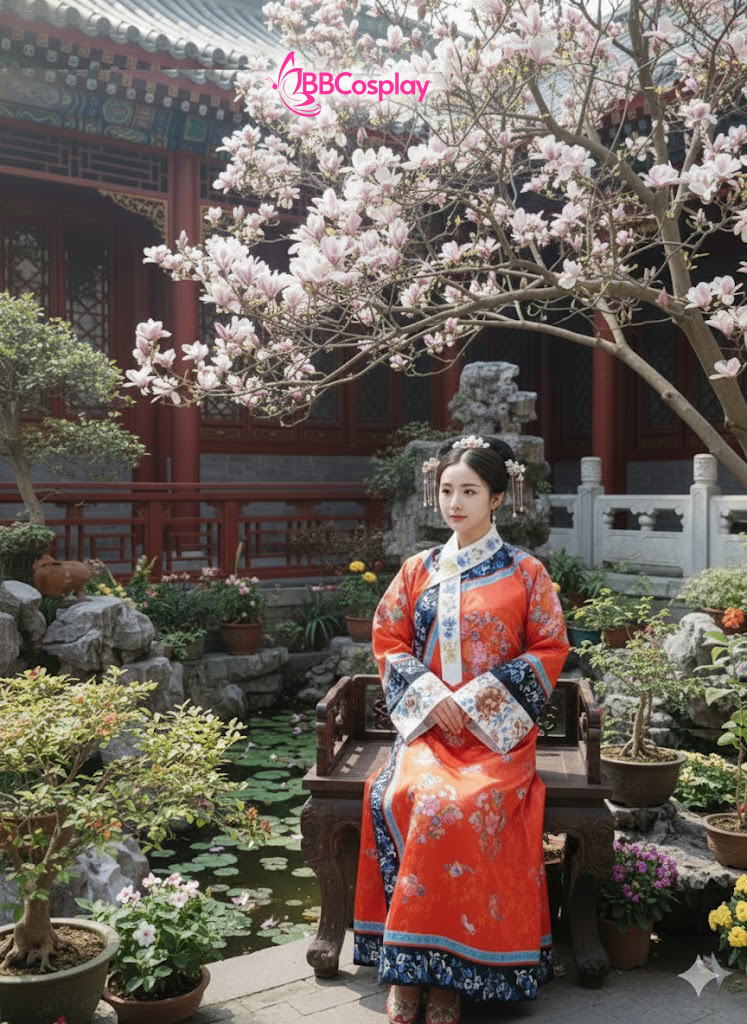 - Điểm nhấn "Đại Lạp Phù": Chiếc mũ đặc trưng của phụ nữ Mãn Thanh được trang trí bằng hoa lụa và trâm cài (điểm thúy). Đây chính là "vương miện" giúp kéo dài tỷ lệ cơ thể và tạo nên thần thái hoàng tộc cho người mặc.
