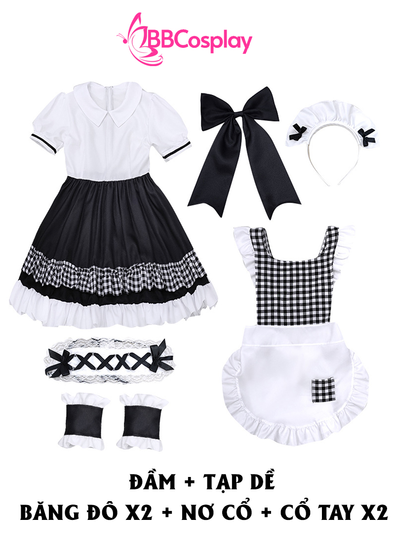 Đồ Nàng Hầu Maid Đen Tạp Dề Trắng Kèm Nhiều Nơ